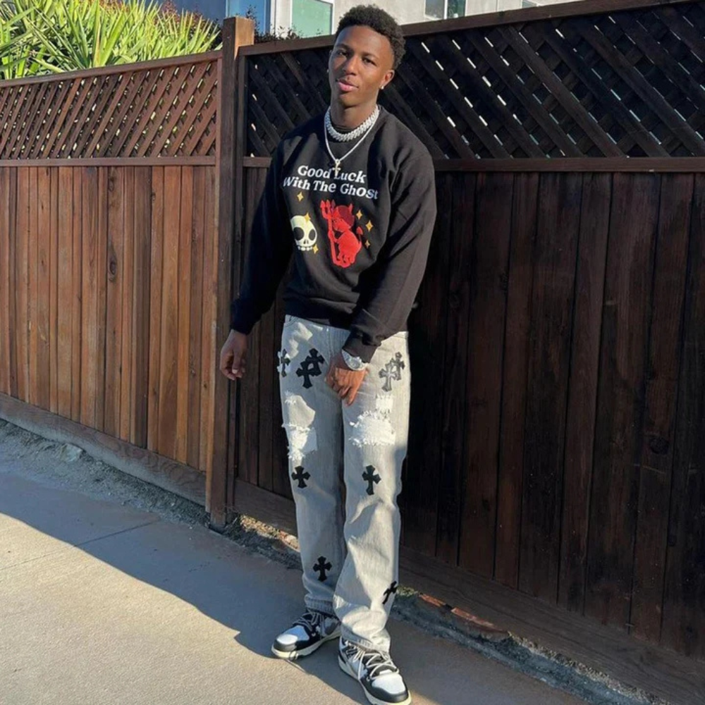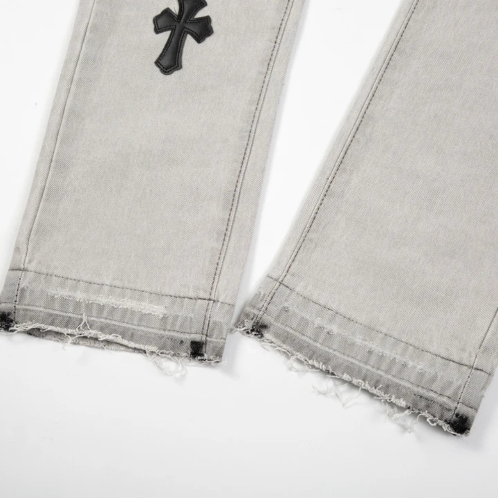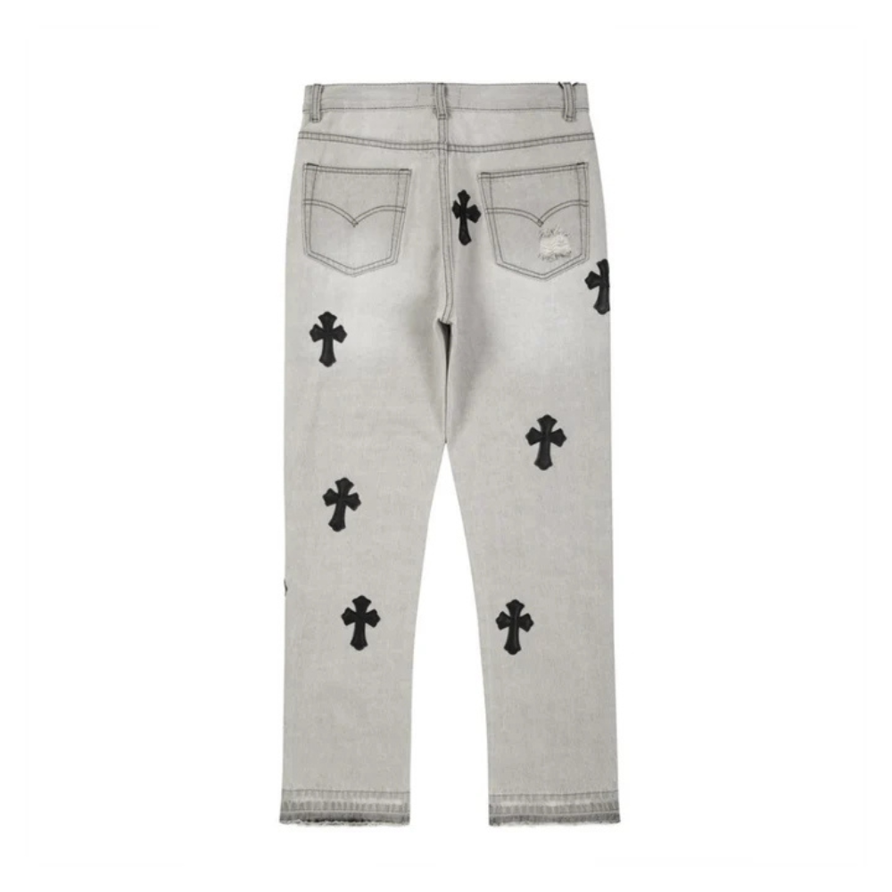 Upgrade your denim game with these stylish American Cross Embroidery Pre-Made Hole Jeans. Made from high-quality denim, these jeans feature a unique cross embroidery design on the front, adding a touch of edginess to your look. The pre-made holes give these jeans a distressed and vintage feel, perfect for any fashion-forward individual.