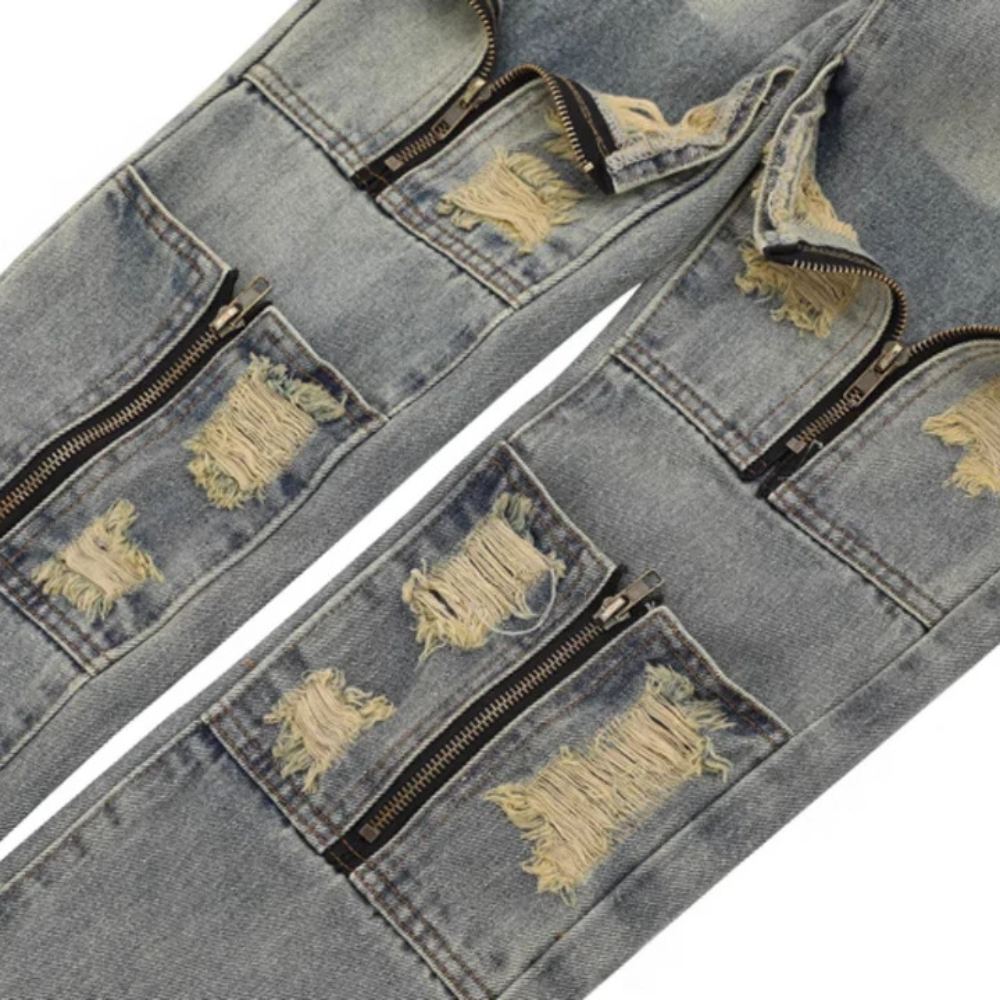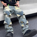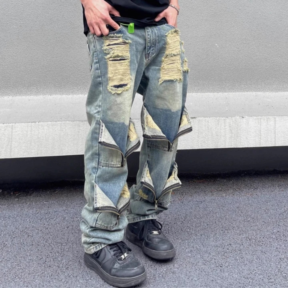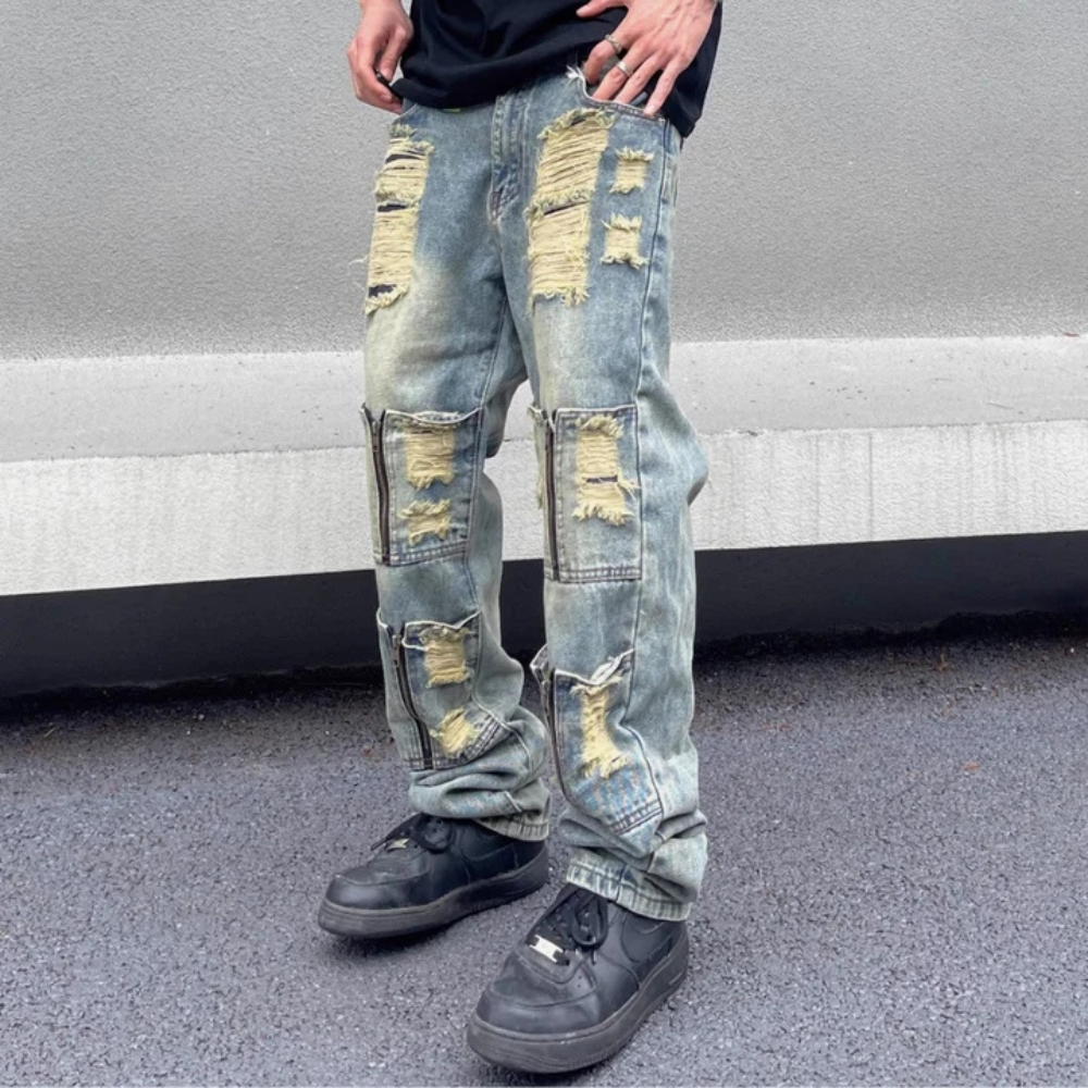 The distressed detailing adds a touch of ruggedness to the classic high street style, giving these jeans a unique and eye-catching look. The distressed patches are strategically placed to create a flattering silhouette, making these jeans suitable for any body type.