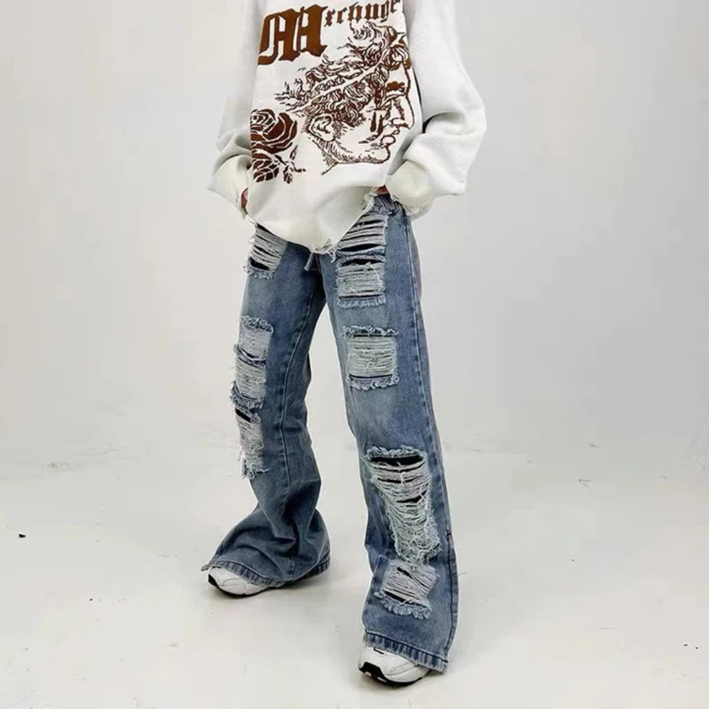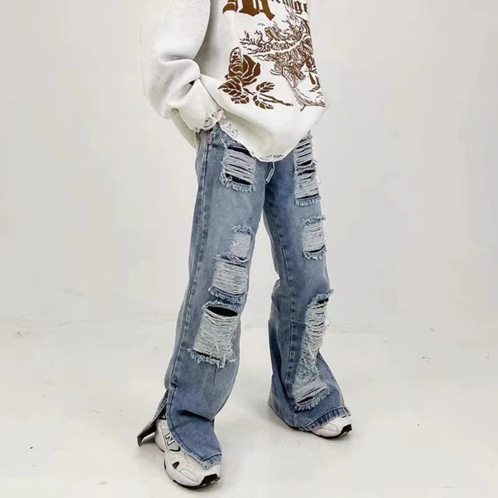 Crafted from high-quality denim, these jeans feature a trendy distressed design with strategically placed holes for a cool and edgy look. The thin section adds a touch of sophistication, making these jeans suitable for any occasion.
