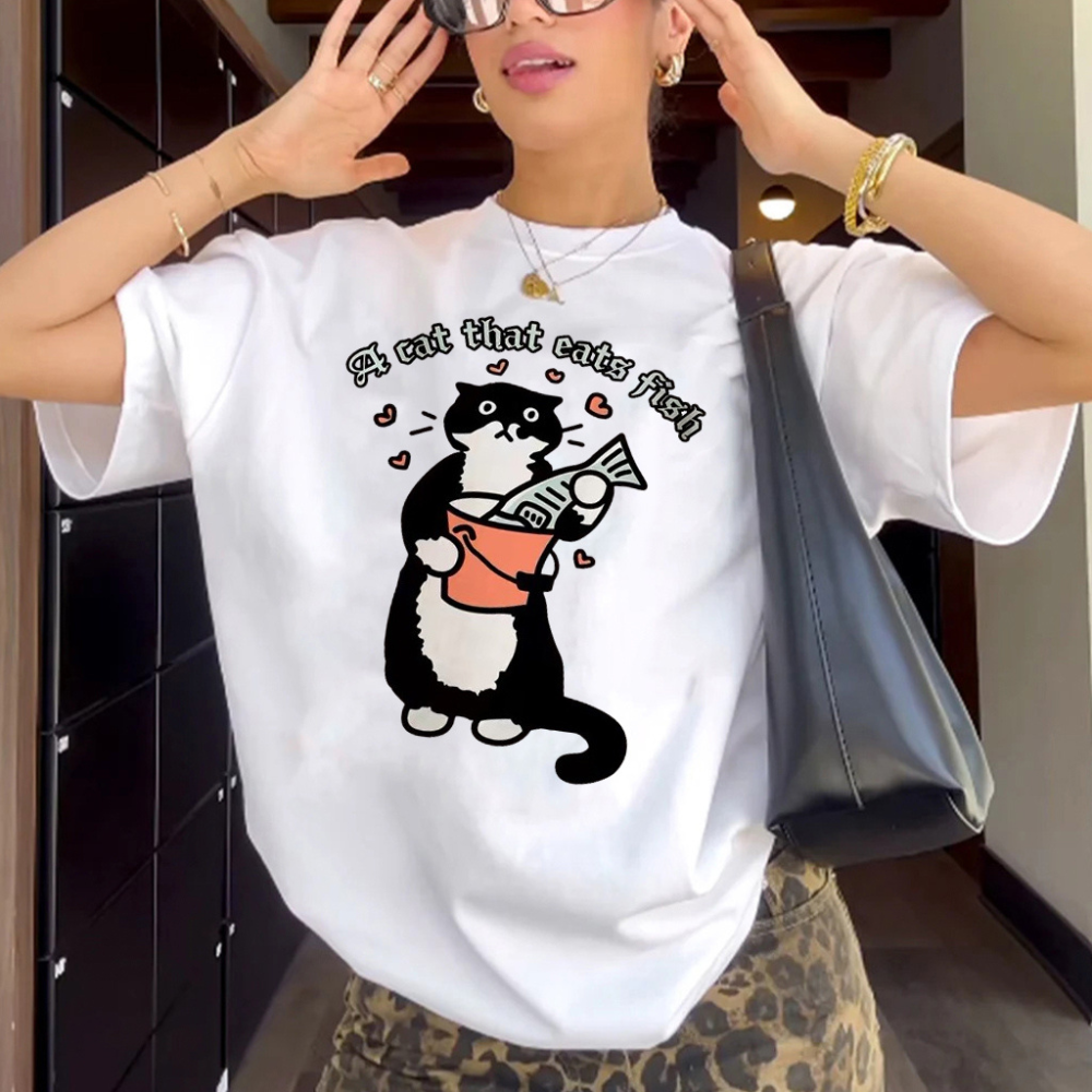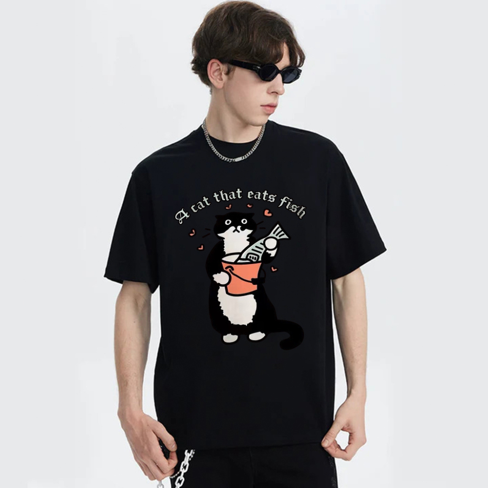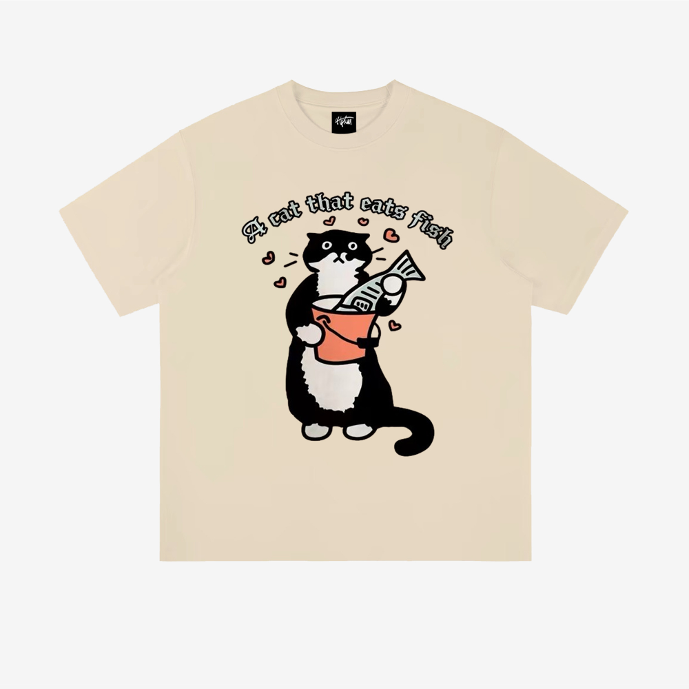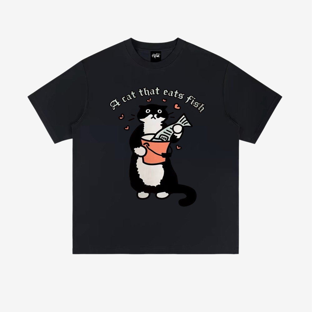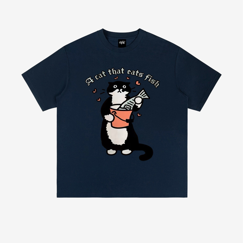 “Urban retro creative cat eating fish cartoon print” T-shirt
