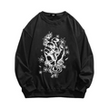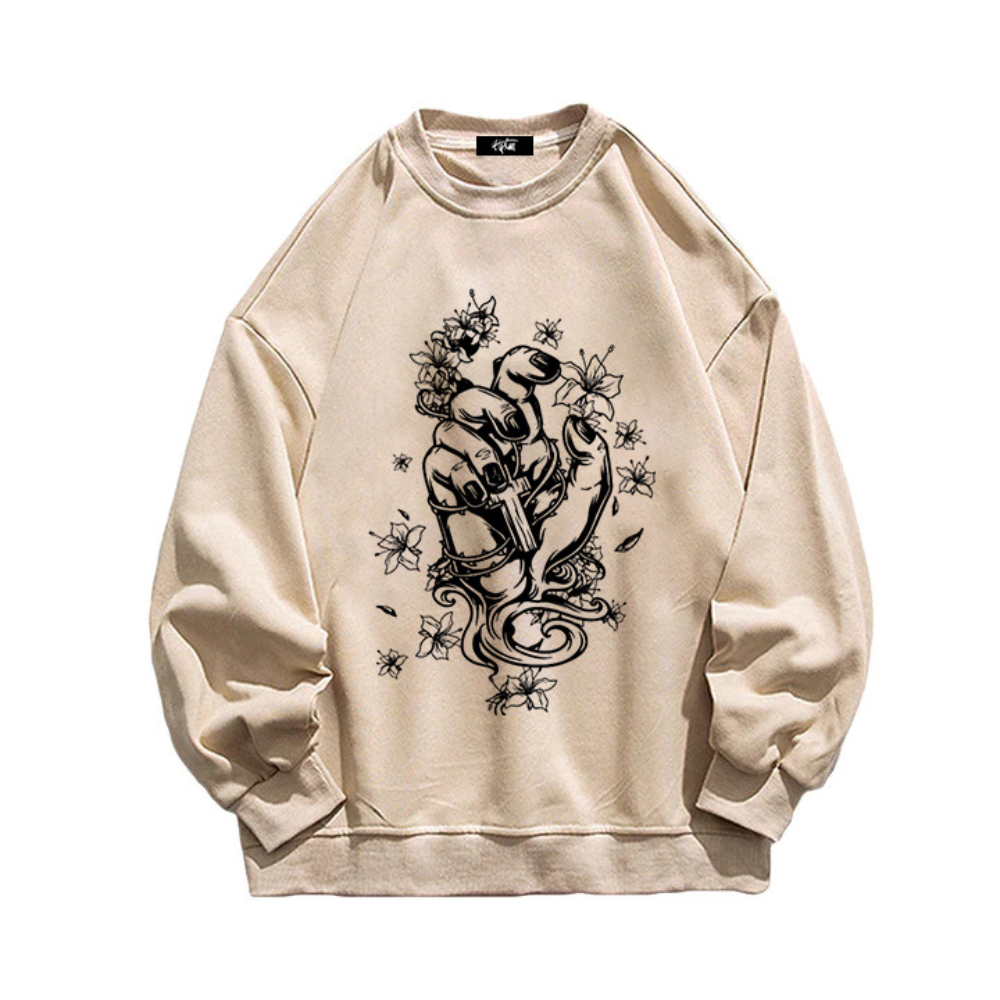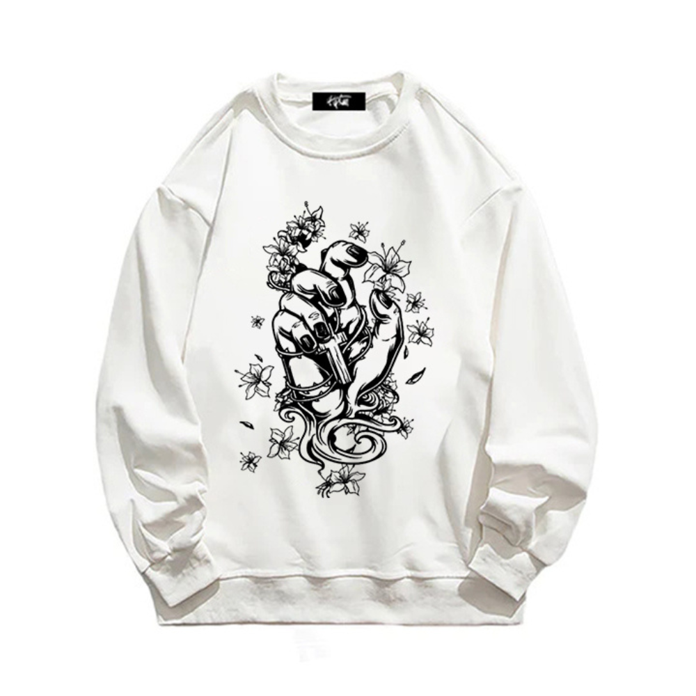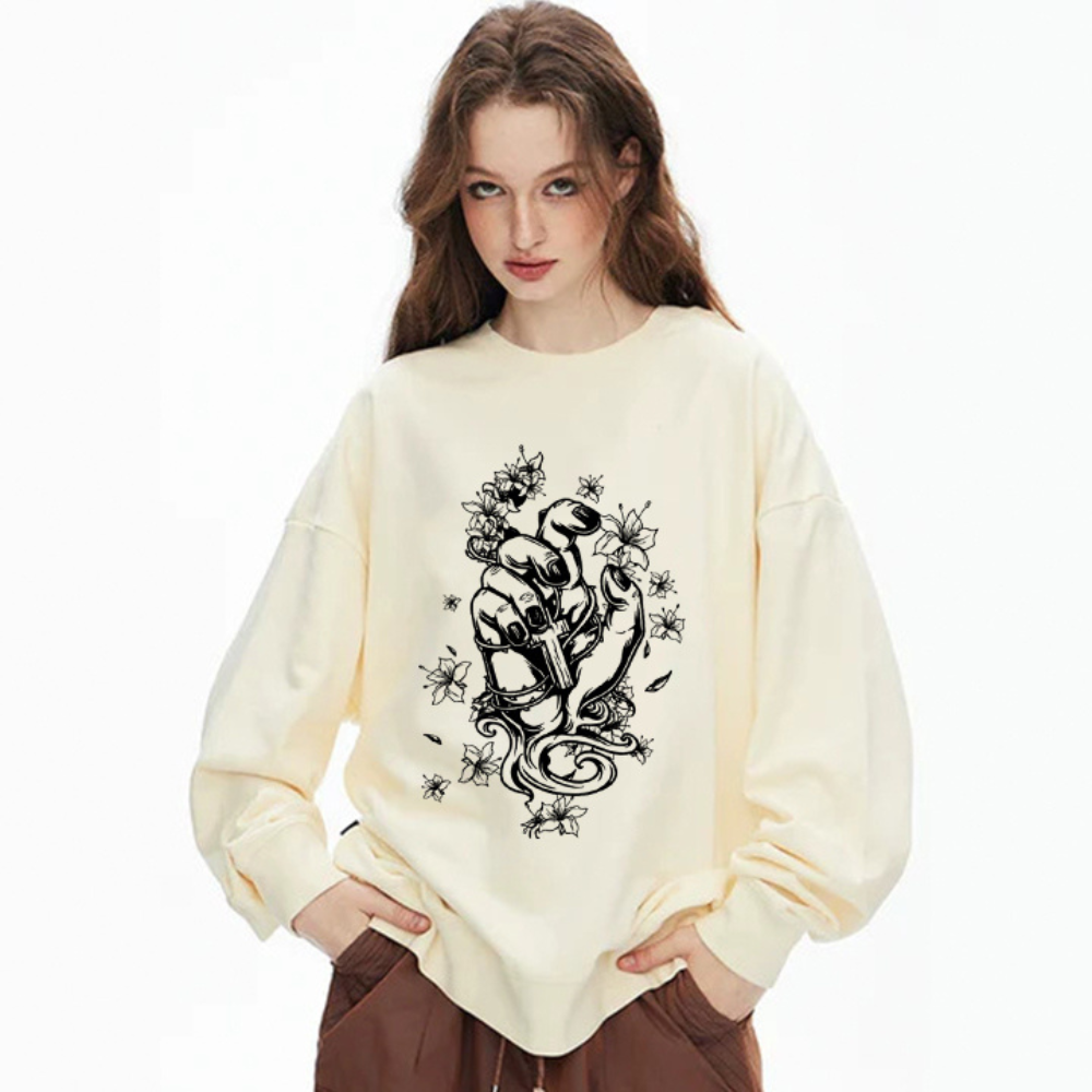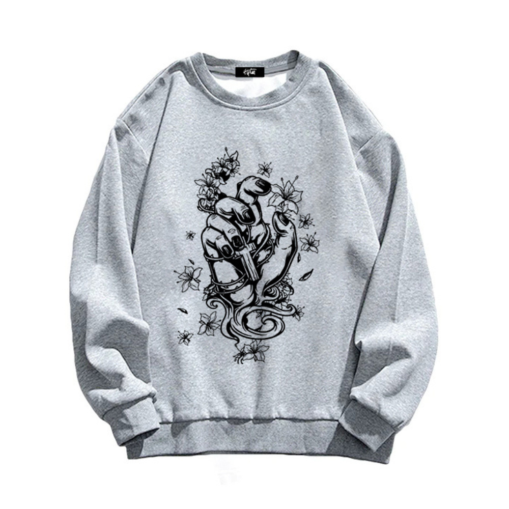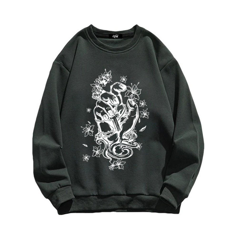 The dark trend flower hand print adds a unique touch to this classic American style sweatshirt. The print is eye-catching and adds a pop of color to the dark background. It's perfect for those who want to make a statement with their fashion choices.