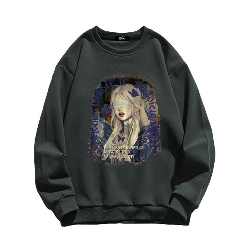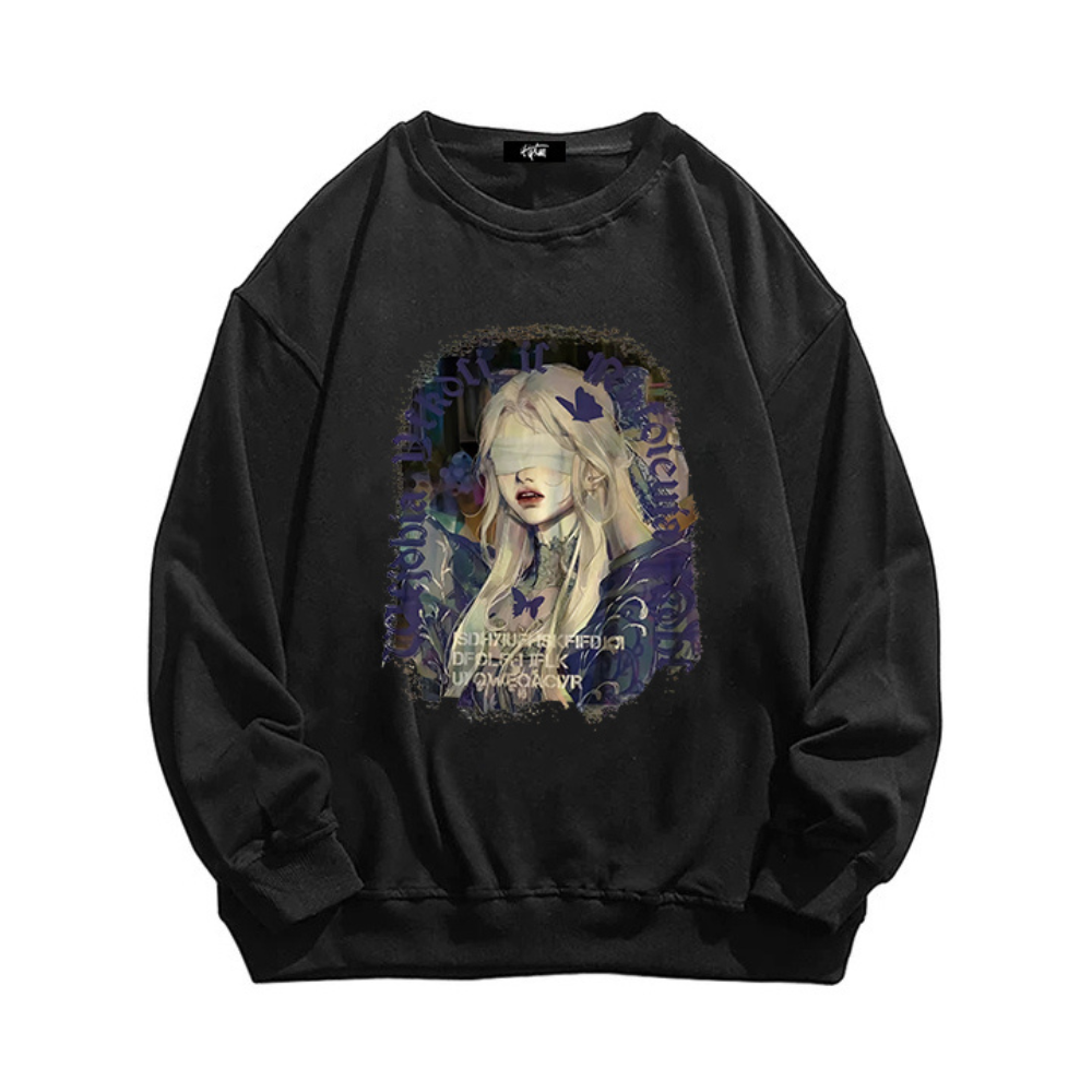 The sweatshirt features a black and white graphic of a blindfolded girl, adding an edgy and mysterious touch to your wardrobe. The high-quality material ensures both warmth and durability, making it perfect for any season.
