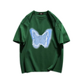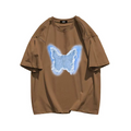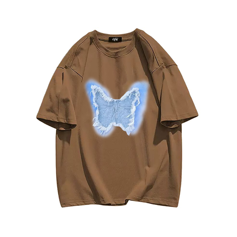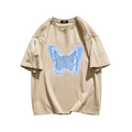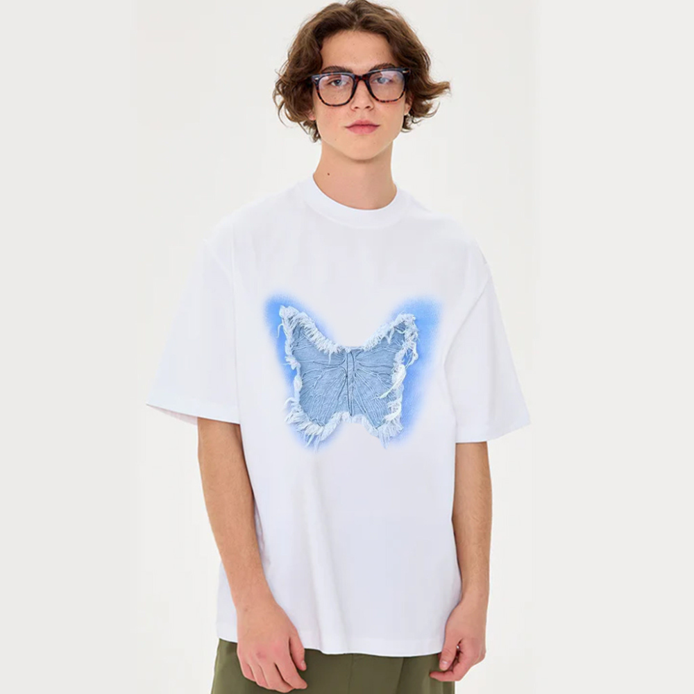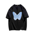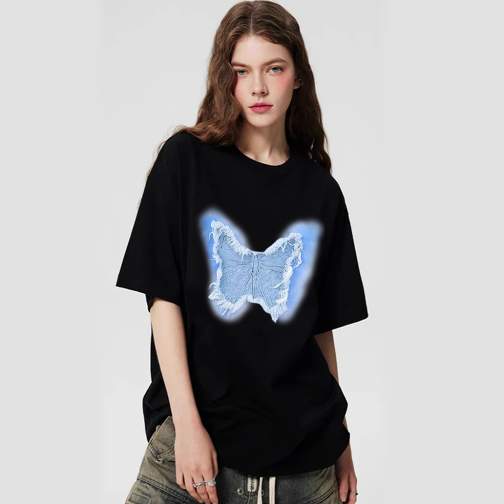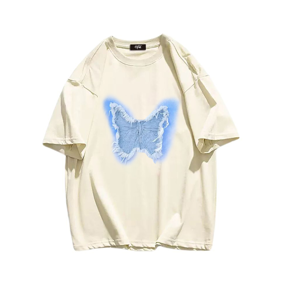 The t-shirt features a classic crew neck and short sleeves, making it a versatile piece that can be worn year-round. The blue denim color adds a cool and edgy vibe, while the butterfly design adds a pop of color and personality.
