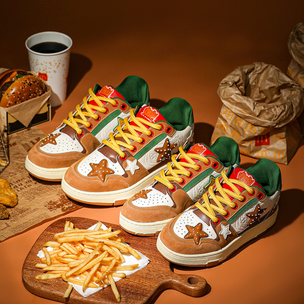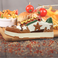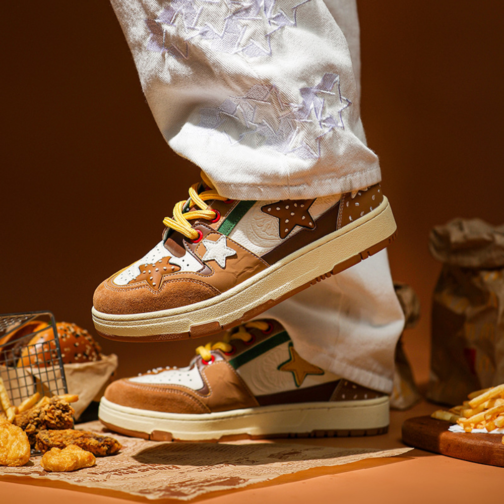 The design features a five-pointed star shape with a mouth-watering burger print on the top. The vibrant colors and intricate details make these shoes stand out in a crowd. They are perfect for casual outings, parties, or even as a conversation starter at a BBQ.
