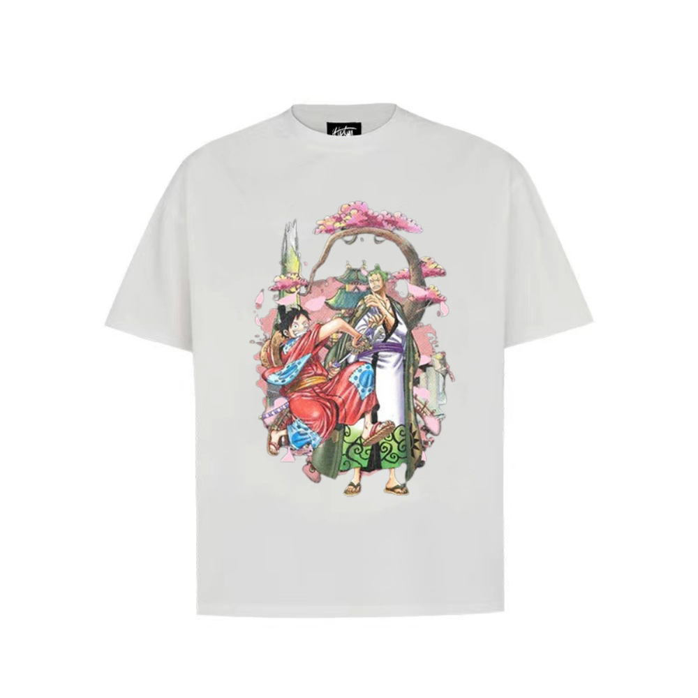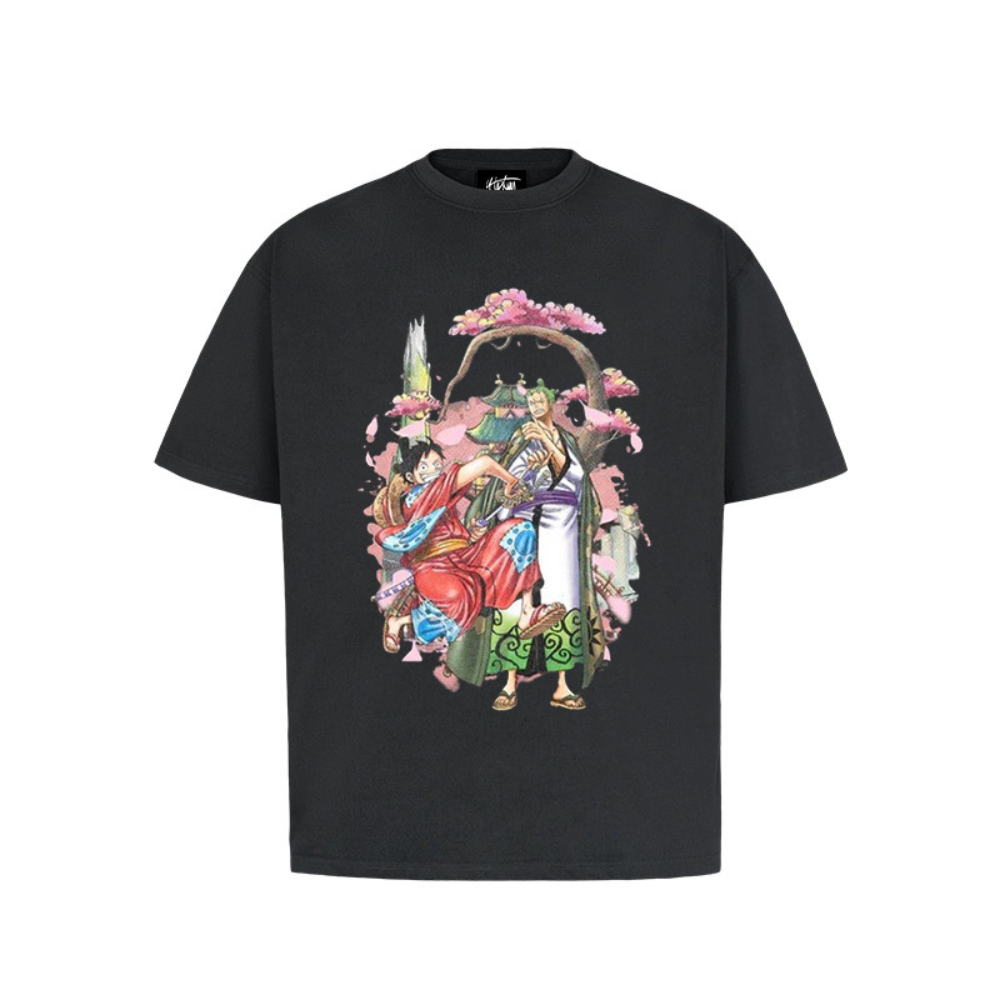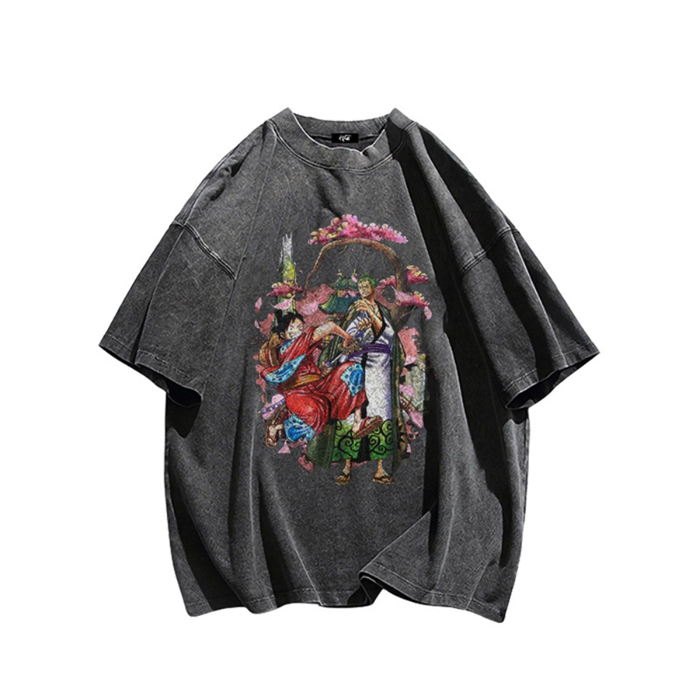 “Cartoon anime Luffy Zoro cherry blossom print” T-shirt