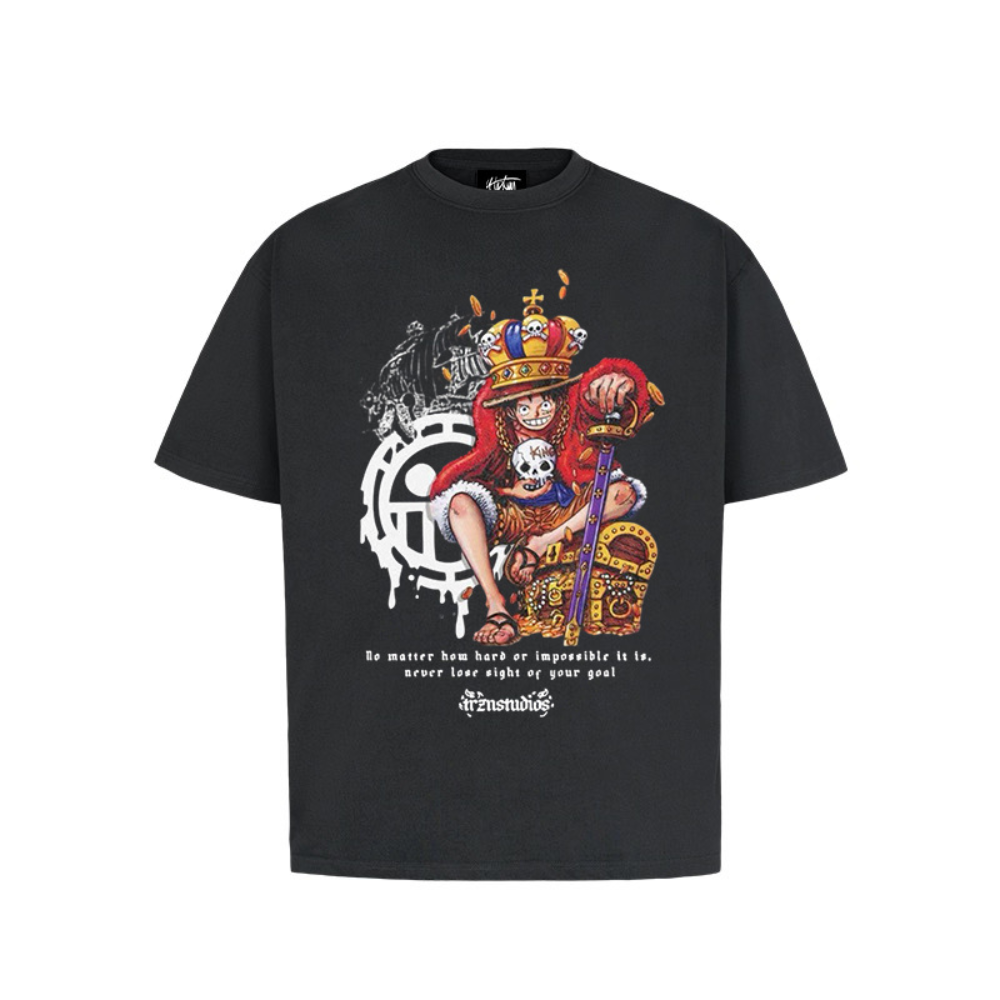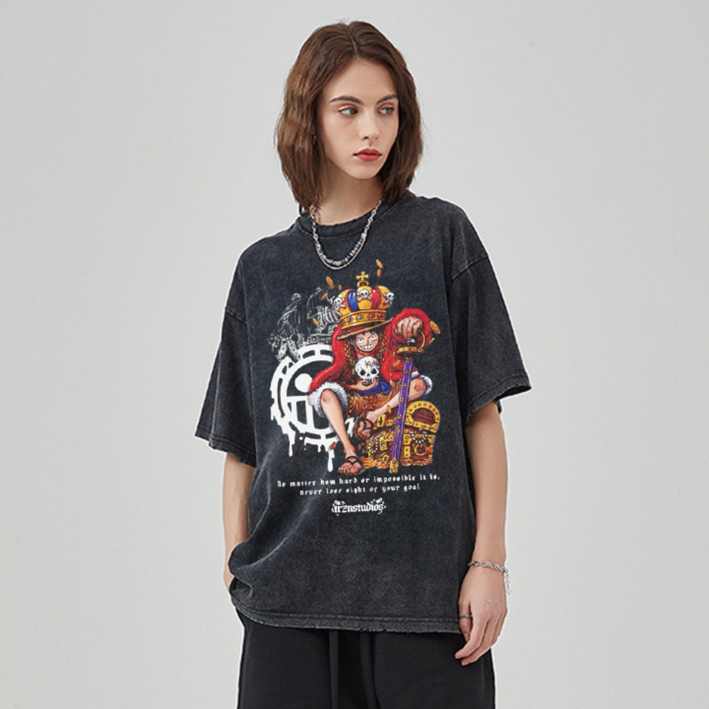 Cartoon Luffy Stepping on a Treasure Chest T-shirt, this unique and eye-catching design features Luffy, a beloved character from the popular anime, stepping on a treasure chest. The graphic is printed on premium soft cotton fabric for all-day comfort.