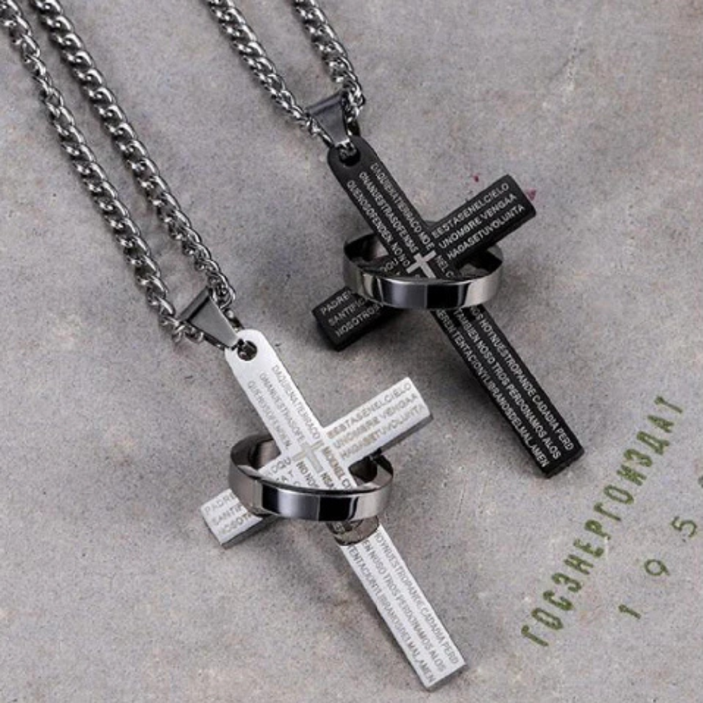 Crucifix And Ring Necklace is an exquisite piece crafted from sterling silver. Its unique design is made up of a sleek crucifix charm and a duo of complementary rings, each intricately detailed with a delicate inscription. Perfect for everyday wear, this versatile necklace promises to add a touch of elegance to your look