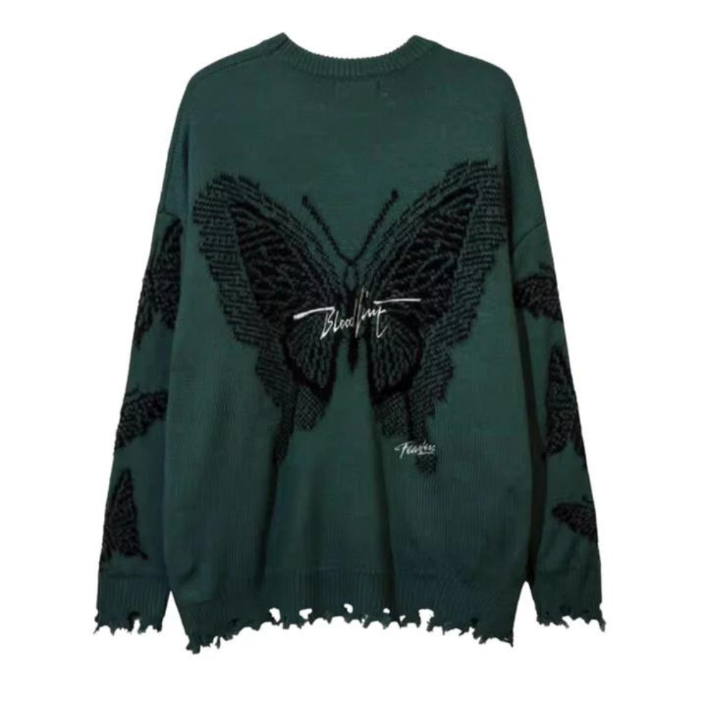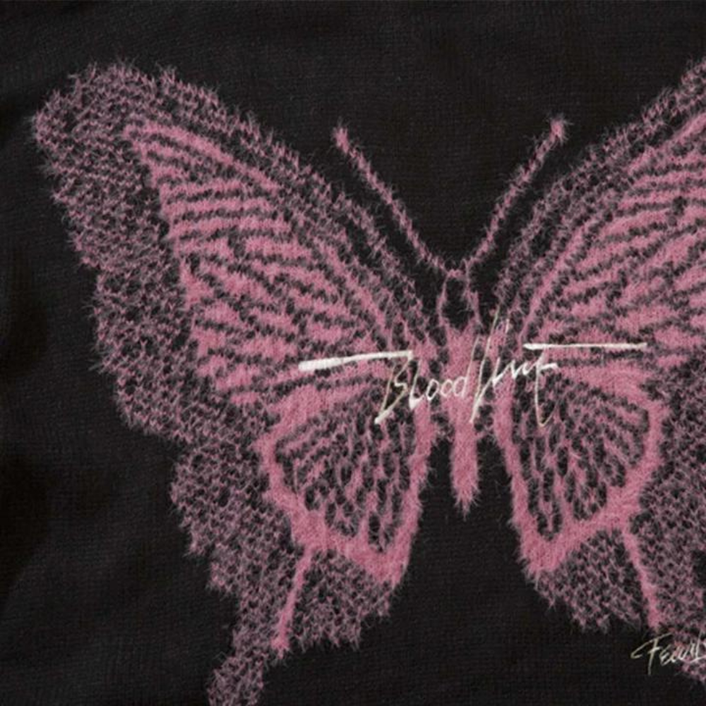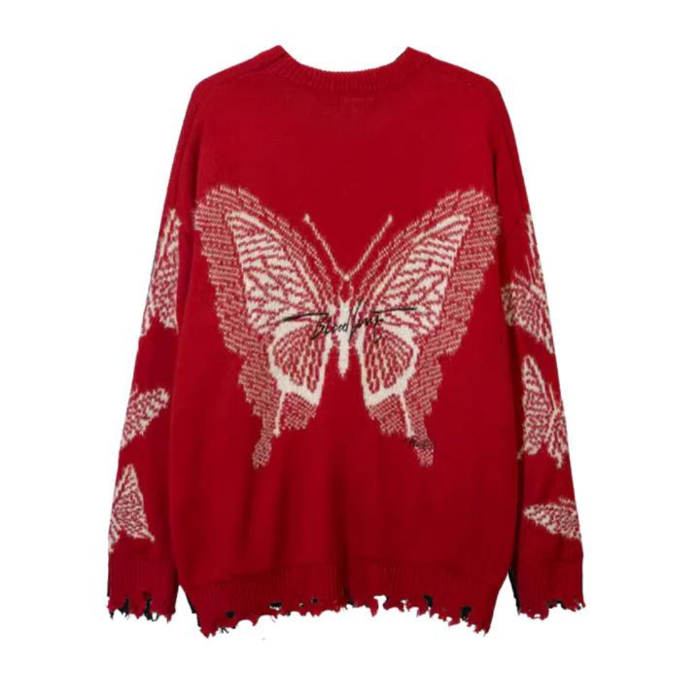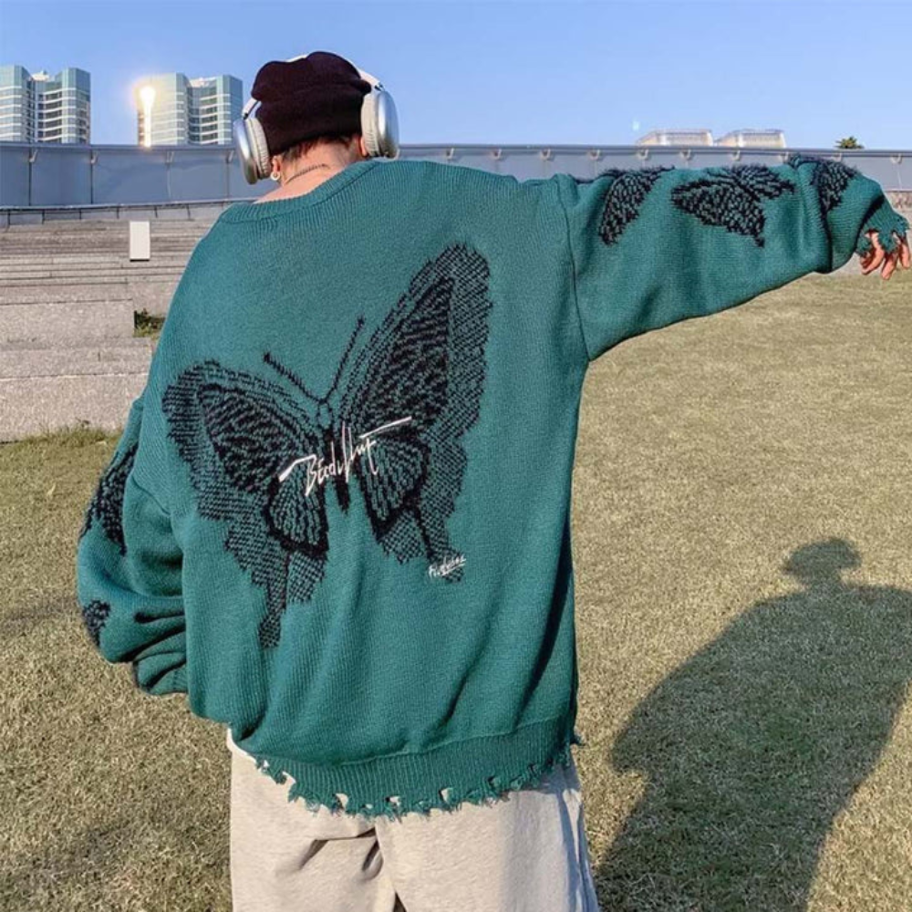 Take the risk and stand out in this striking butterfly letter jacquard sweater. Let the bold colors and eye-catching jacquard pattern soar to new heights of fashion! Dare to be different in this statement-making streetwear piece.