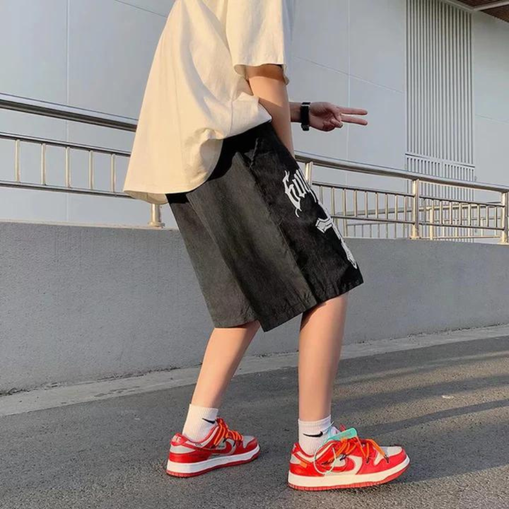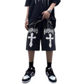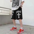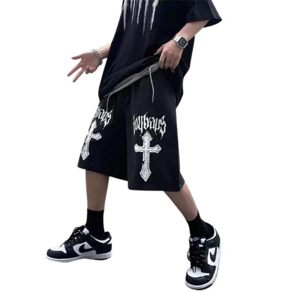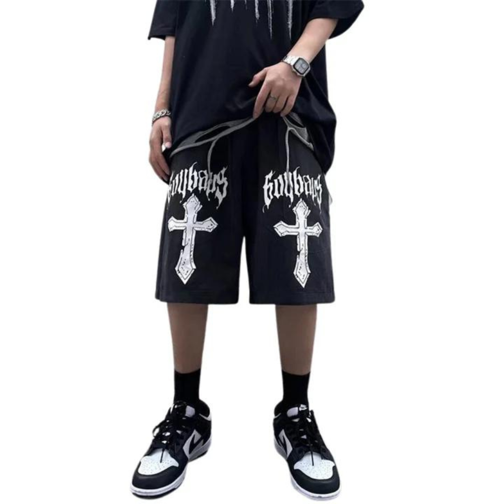 Introducing our latest addition to the High Street Gothic collection - the Alphabet Cross Shorts. These unique and edgy shorts feature a bold cross design made up of gothic-style letters, creating a striking and eye-catching look. Made from high-quality materials, these shorts are both comfortable and durable, perfect for everyday wear or for making a statement at a special event.