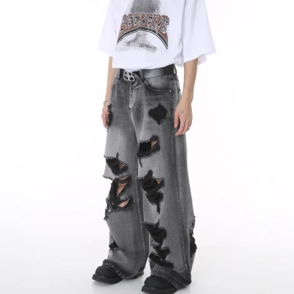 Crafted from high-quality denim, these jeans feature a unique irregular rip design that adds a touch of rebelliousness to your look. The baggy fit ensures maximum comfort and allows for easy movement, making them perfect for any occasion.