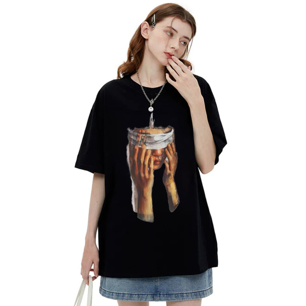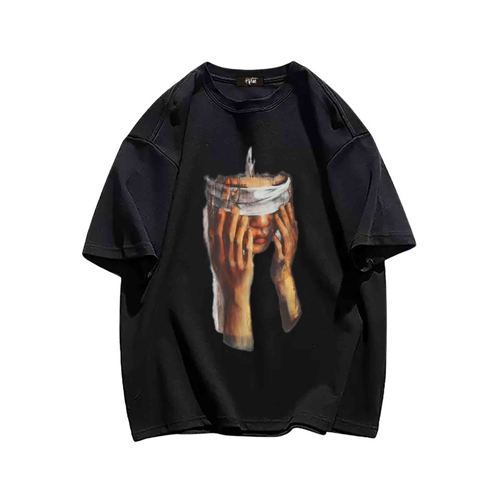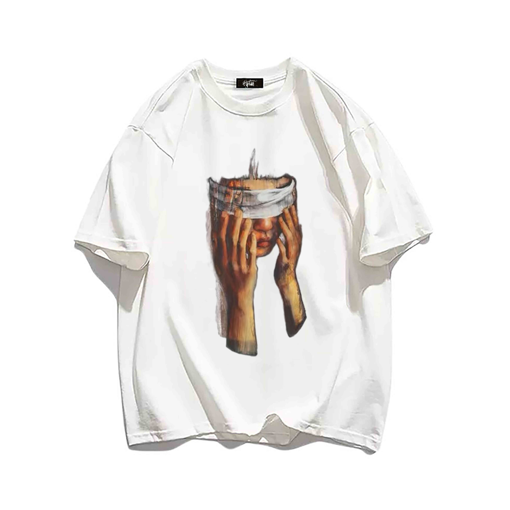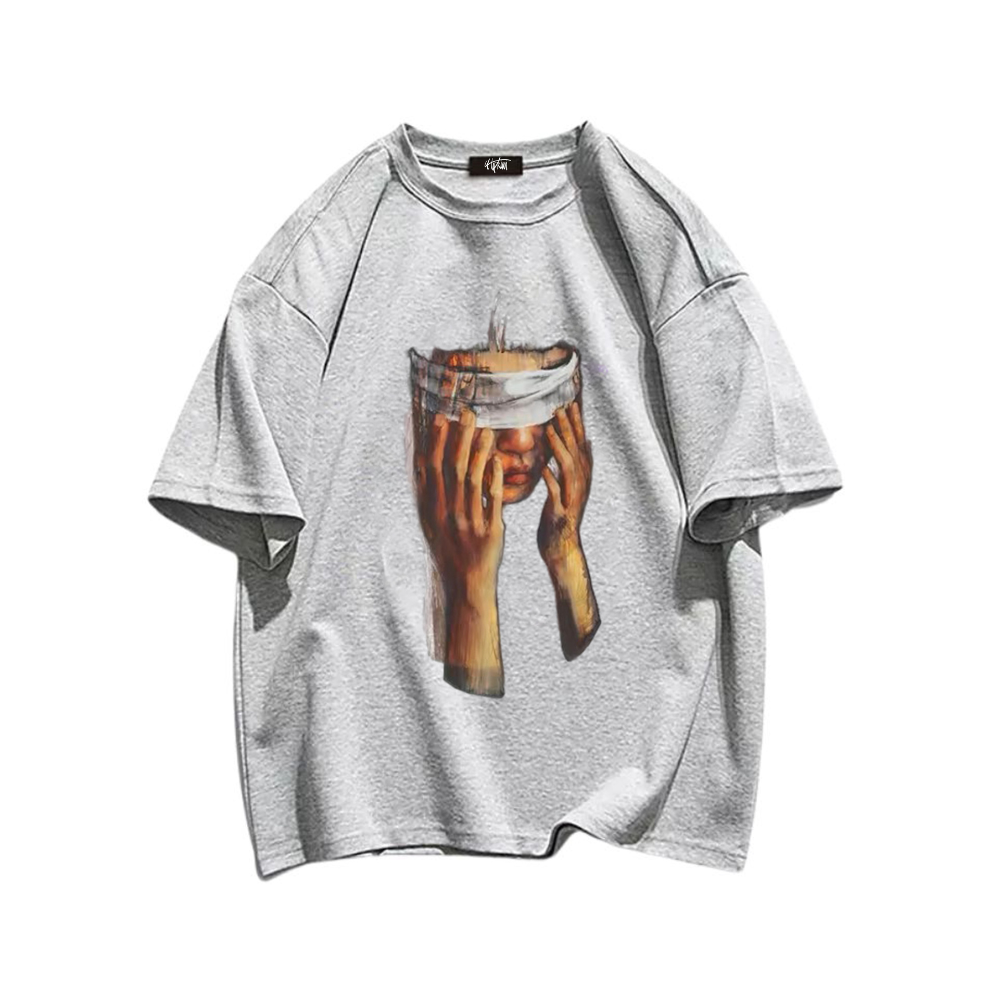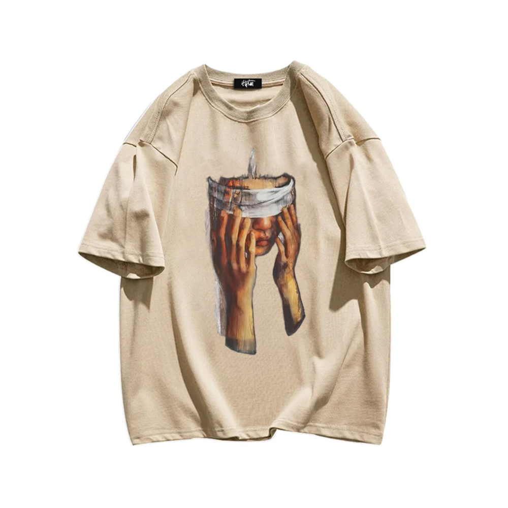 The design features a striking image of a person with a bandaged head and a blindfold, symbolizing the struggles and challenges we face in life. The bold font adds to the overall impact of the design, making it a conversation starter wherever you go.