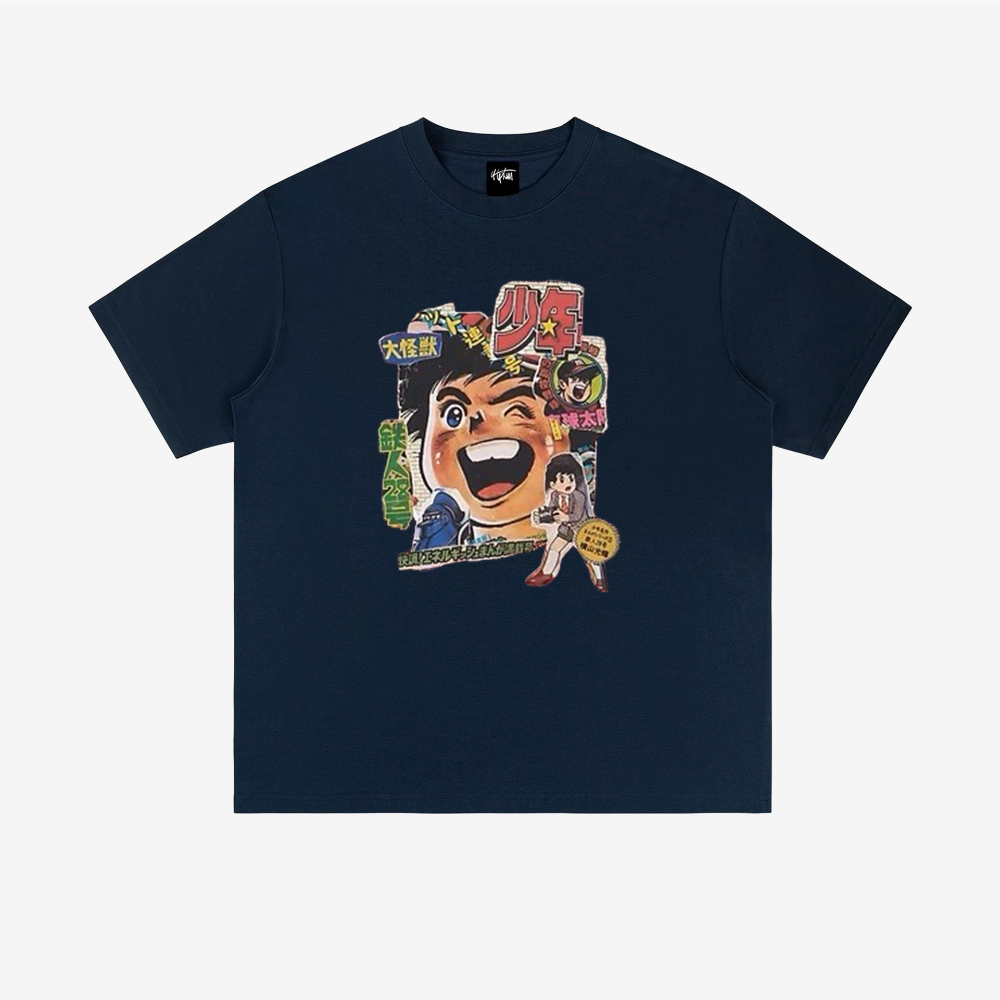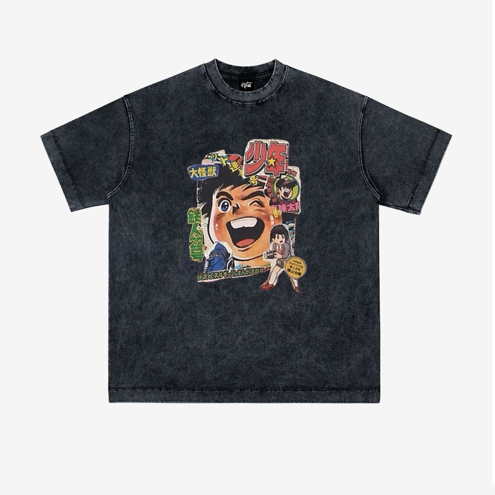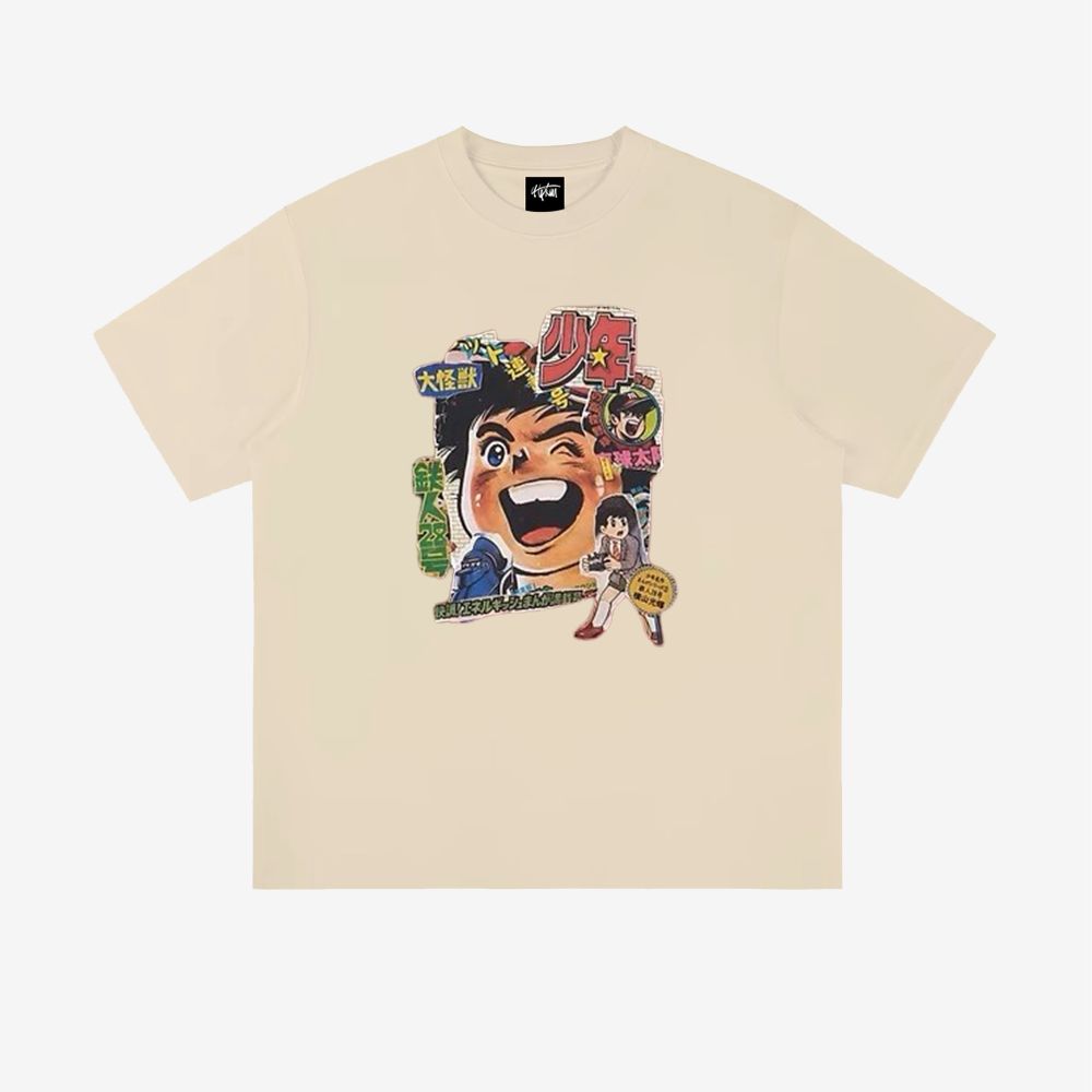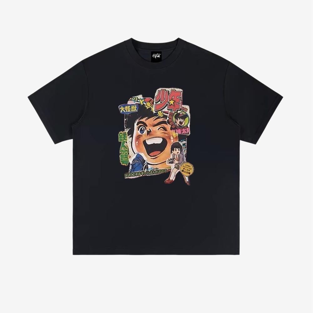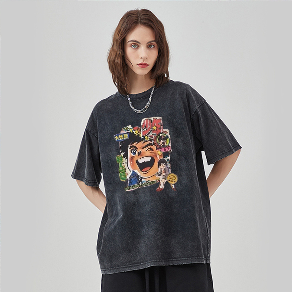 The front of the T-shirt showcases a cartoon illustration of a happy Japanese boy surrounded by colorful letters and symbols, giving off a fun and playful vibe. The print is of high quality and will not fade or peel, ensuring that you can enjoy wearing this T-shirt for a long time.