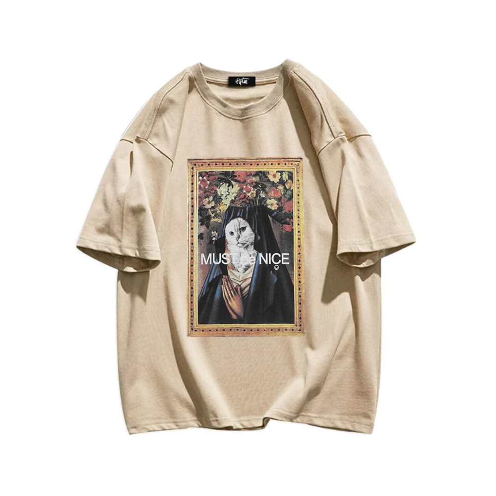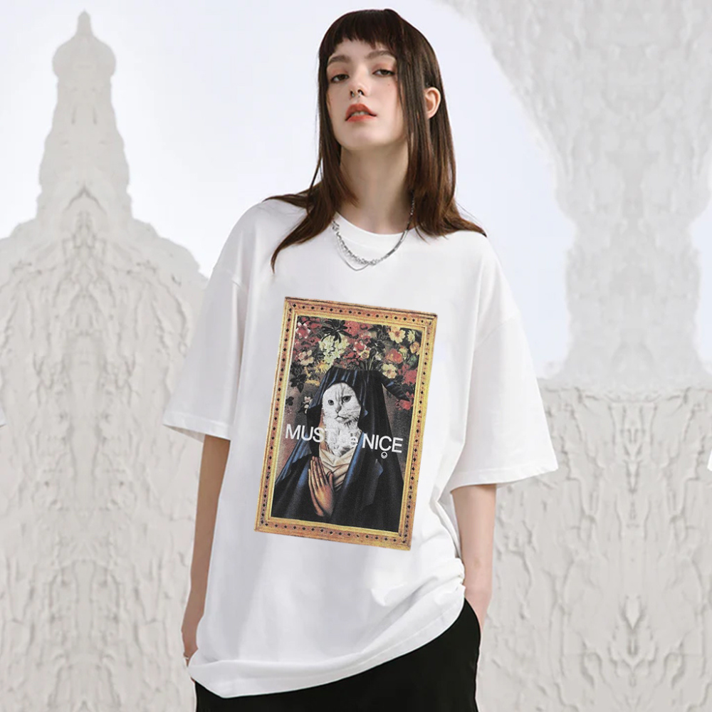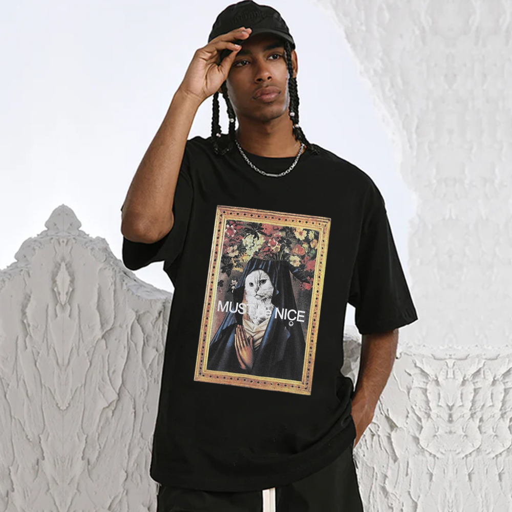 Available exclusively at Hip Kiwi, this T-shirt is a must-have for any cat lover or fashion enthusiast. The high-quality print and vibrant colors make it a standout piece in any wardrobe. Whether you're lounging at home or out and about, this T-shirt will add a touch of whimsy and charm to your look.