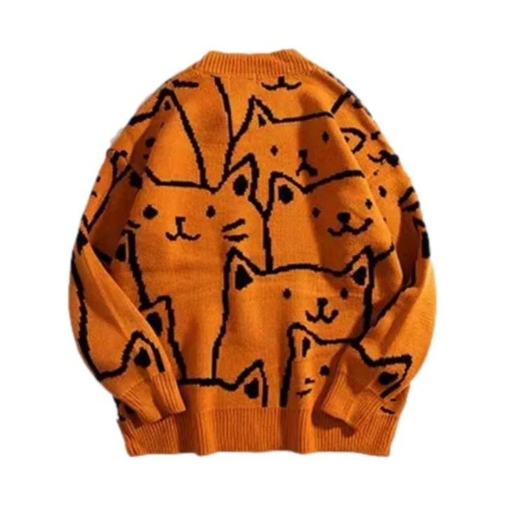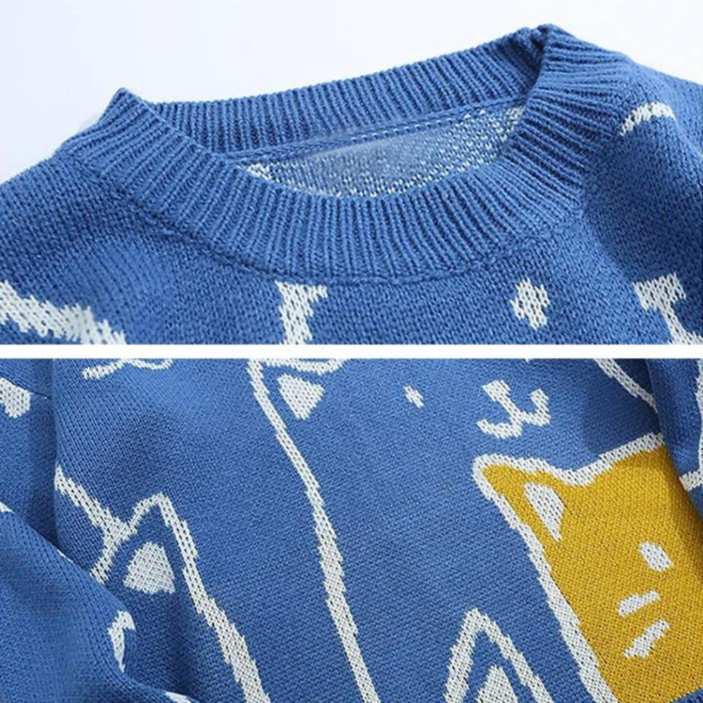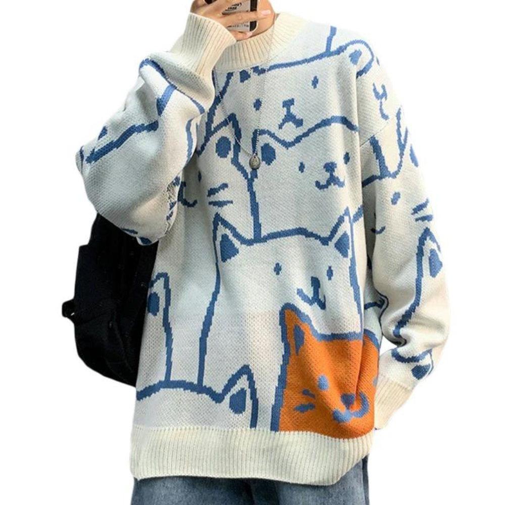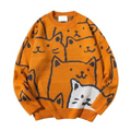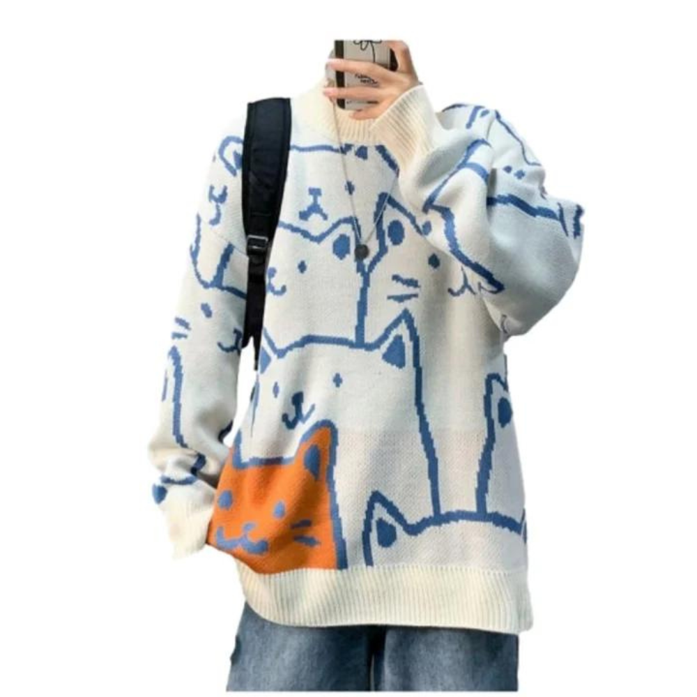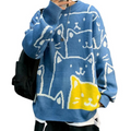Crafted from a soft and comfortable blend of high-quality materials, this sweater is designed to keep you warm and comfortable all day long. The adorable cartoon cat print on the front of the sweater is perfect for those who love playful and childlike designs.