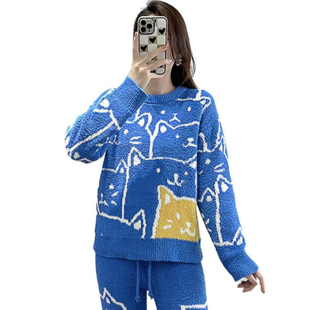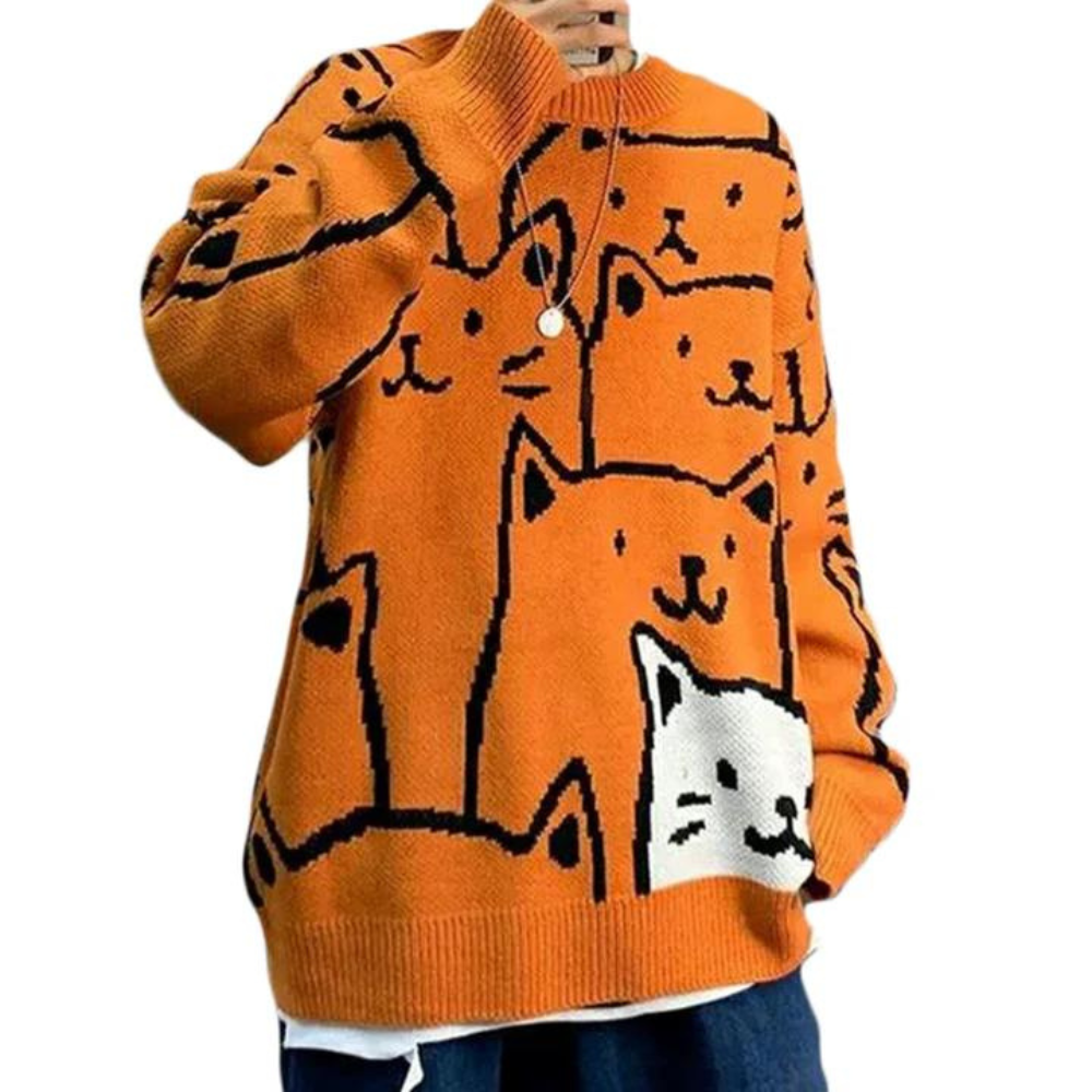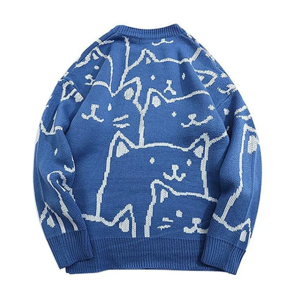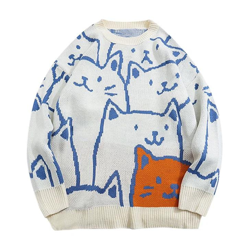 Crafted from a soft and comfortable blend of high-quality materials, this sweater is designed to keep you warm and comfortable all day long. The adorable cartoon cat print on the front of the sweater is perfect for those who love playful and childlike designs.