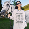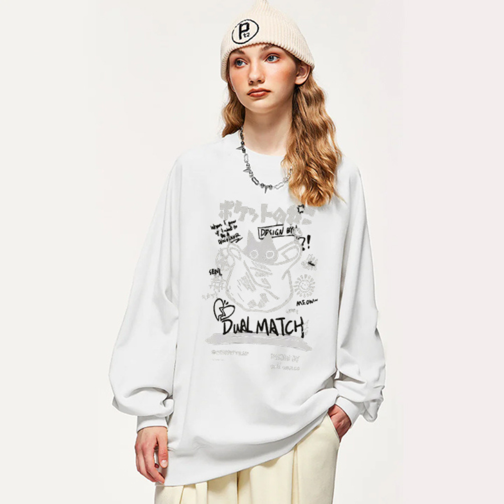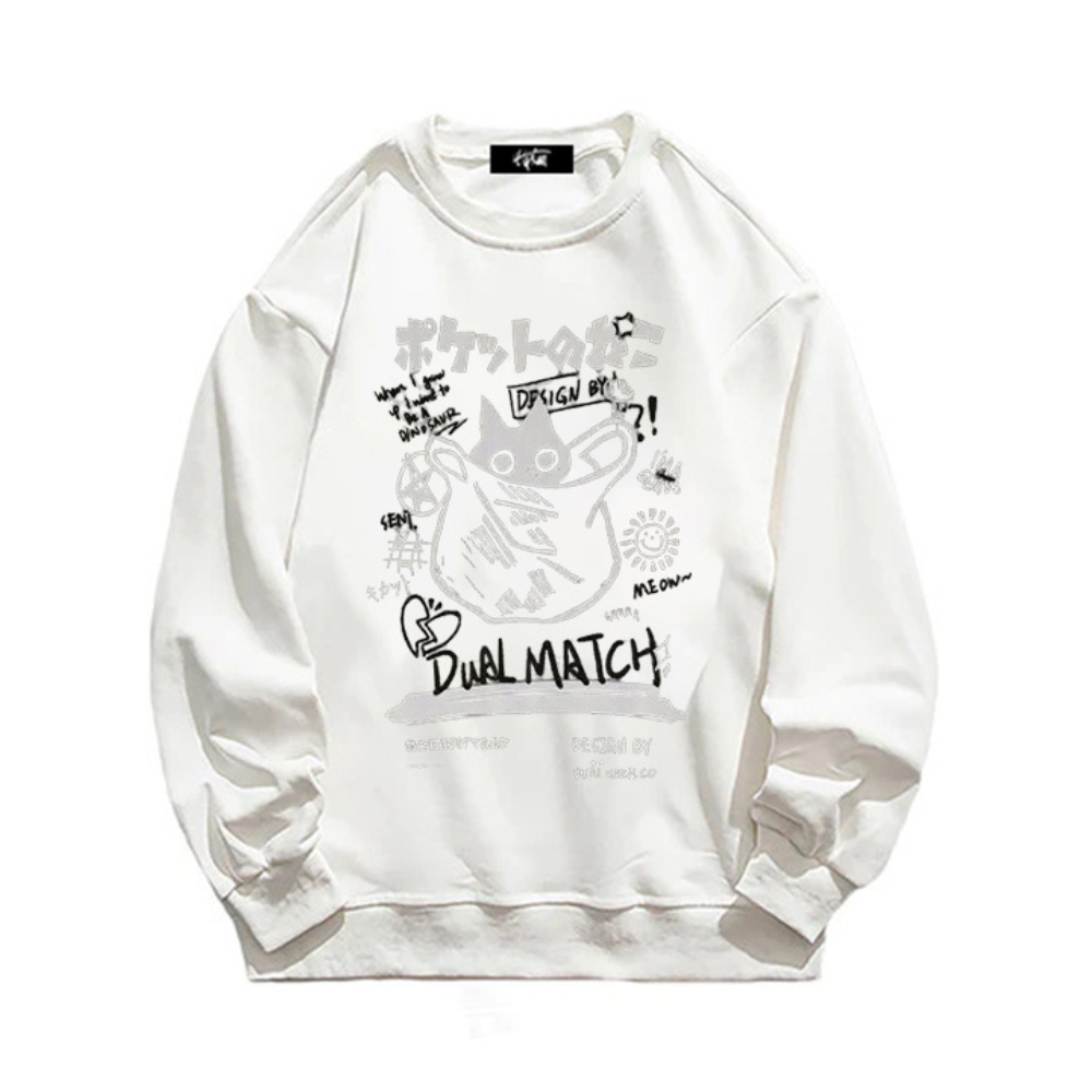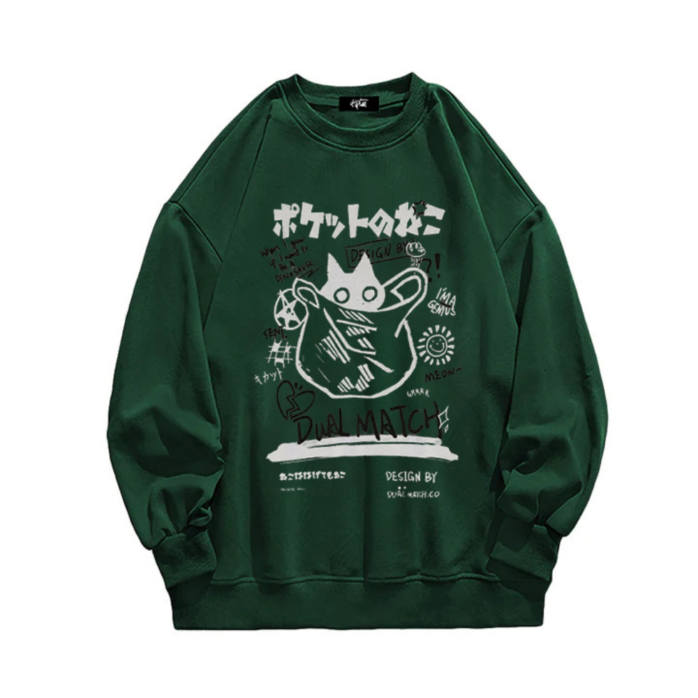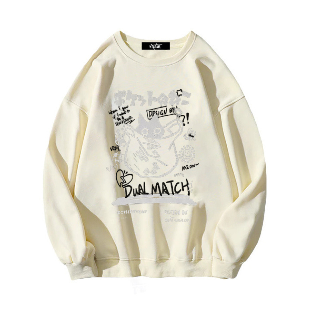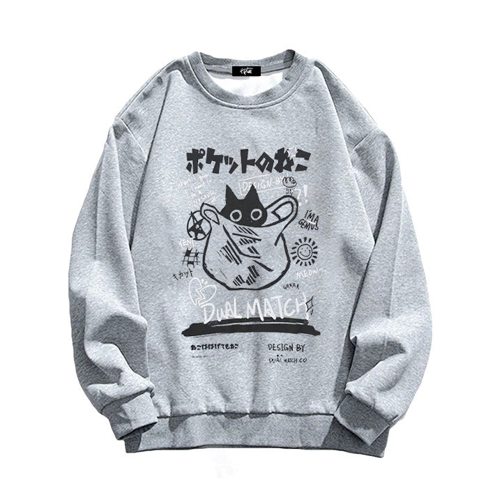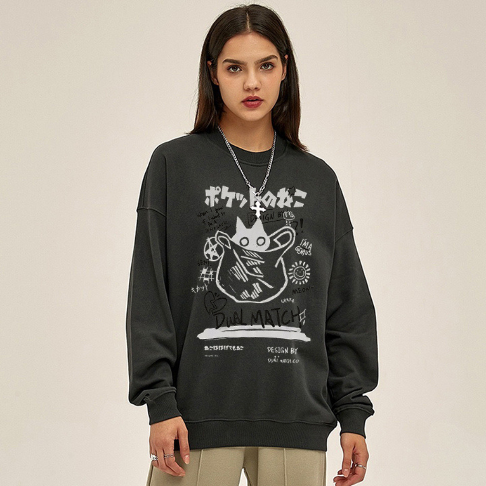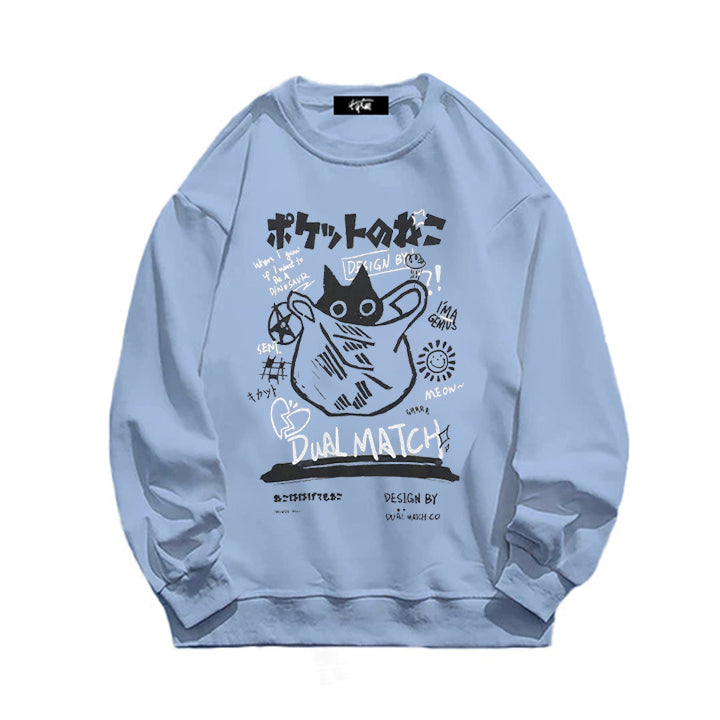 The eye-catching print of a cat inside a trash bag is sure to turn heads and make a statement. Perfect for casual outings or lounging at home, this sweatshirt is a must-have for any cat lover's wardrobe. The soft fabric and relaxed fit make it perfect for all-day wear, while the bold design adds a touch of edginess to any outfit.