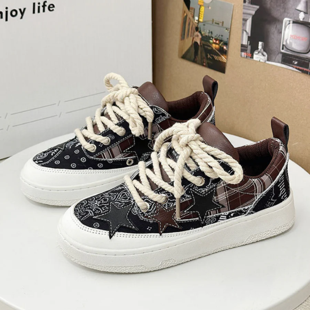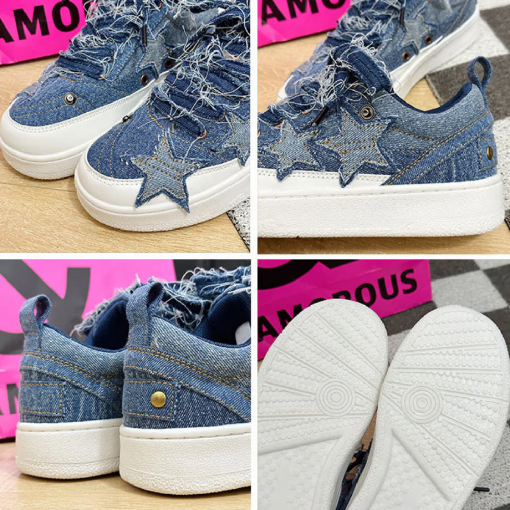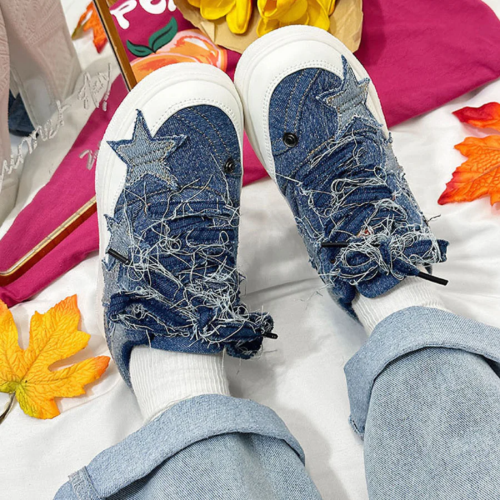 Introducing our latest addition to the Hip Kiwi shoe collection - the Retro Denim Patch Star Shoes. These stylish and unique shoes are perfect for those who love a touch of retro fashion in their wardrobe. Made with high-quality denim material, these shoes feature a patchwork design with star-shaped patches in various shades of blue. The laces are made of durable cotton and the sole is made of sturdy rubber, ensuring comfort and durability. These shoes are perfect for casual outings, parties, or even a day at the office.