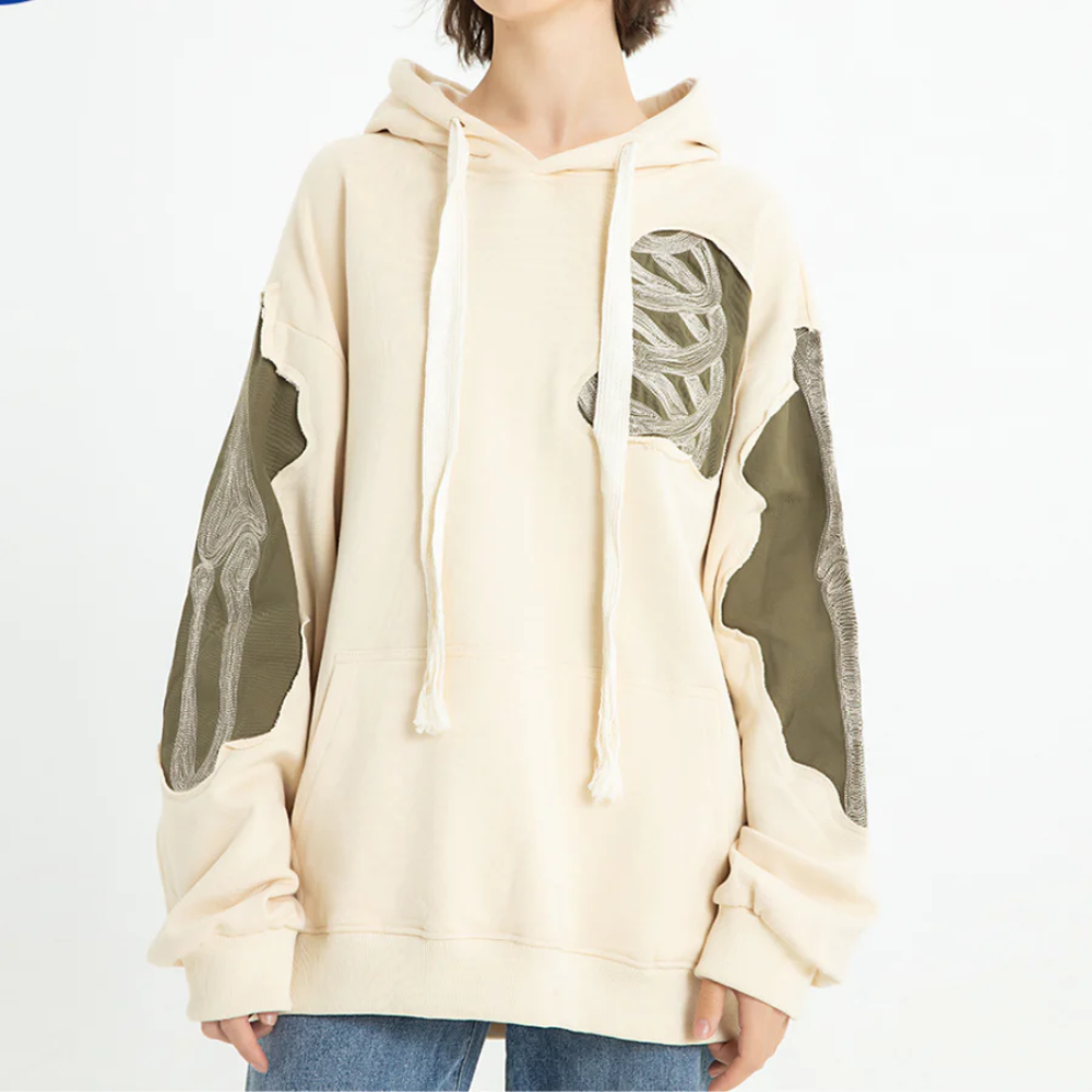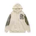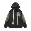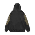 The unique patchwork design adds a trendy and edgy touch to the classic hoodie style. The ripped details give it a worn-in look, making it a must-have for any fashion-forward individual. The hoodie also features a spacious front pocket, perfect for storing your essentials while on the go.