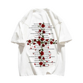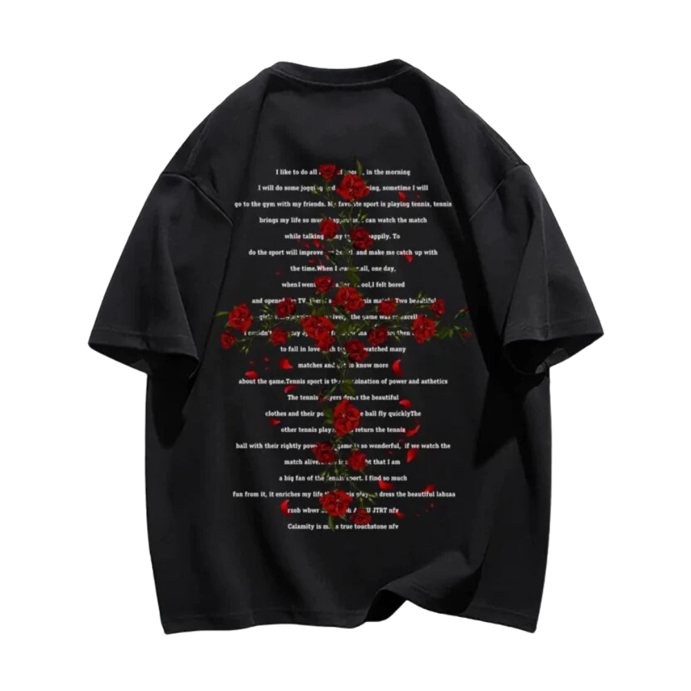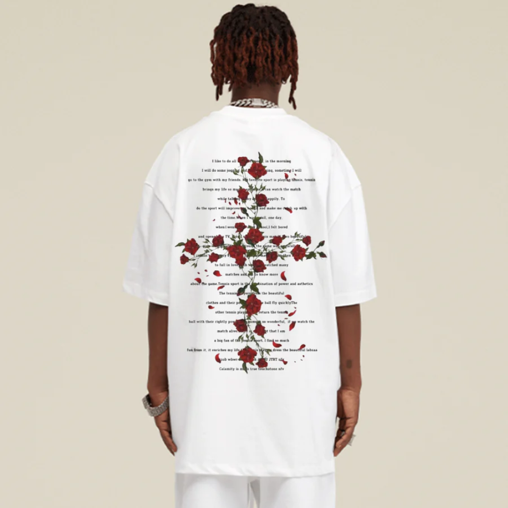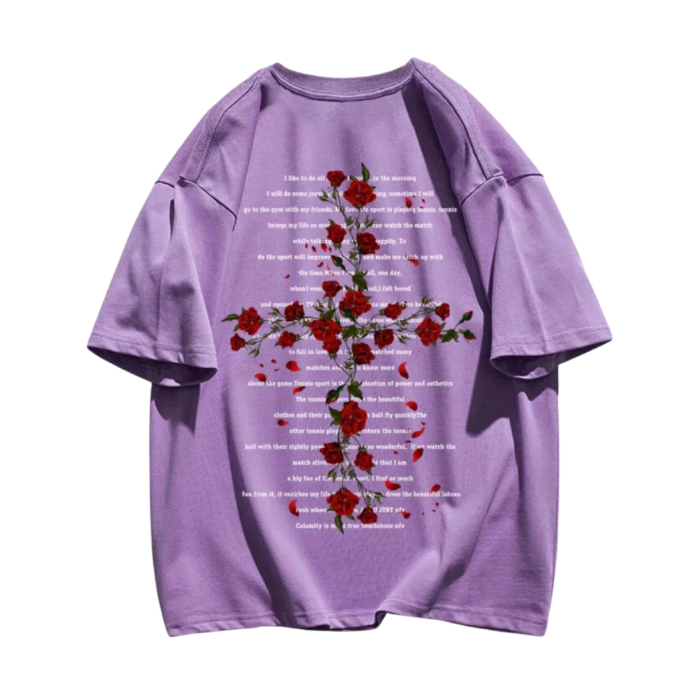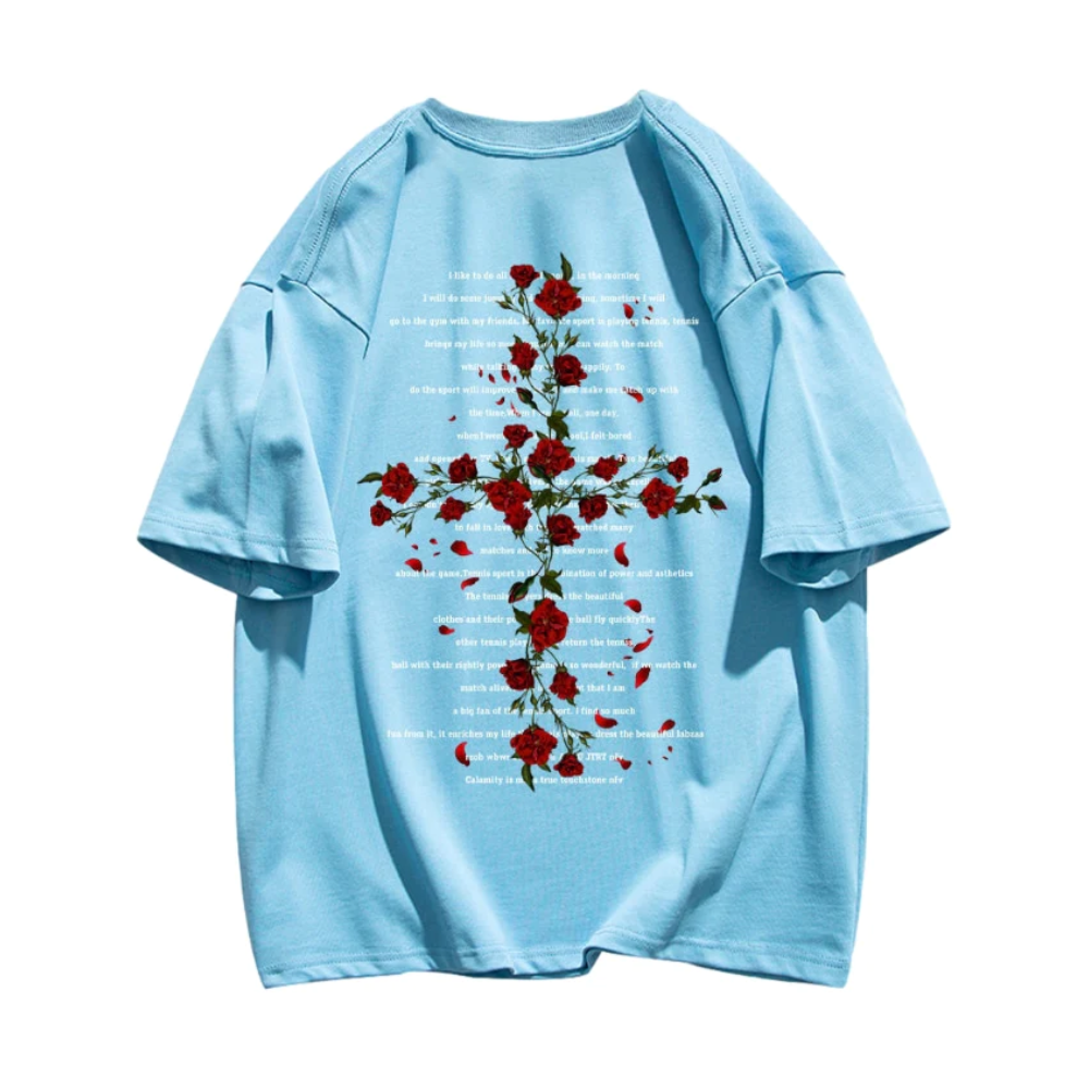 The rose symbolizes love and beauty, while the cross represents faith and spirituality, making this t-shirt a meaningful and fashionable choice. The print is carefully crafted to ensure vibrant colors and crisp details, making it a standout piece in any outfit. Available in a range of sizes, this t-shirt is suitable for both men and women.