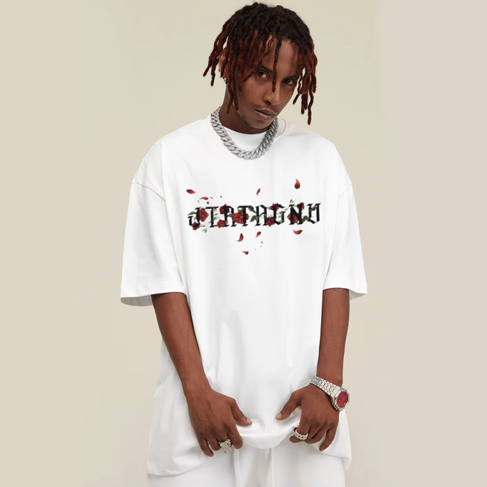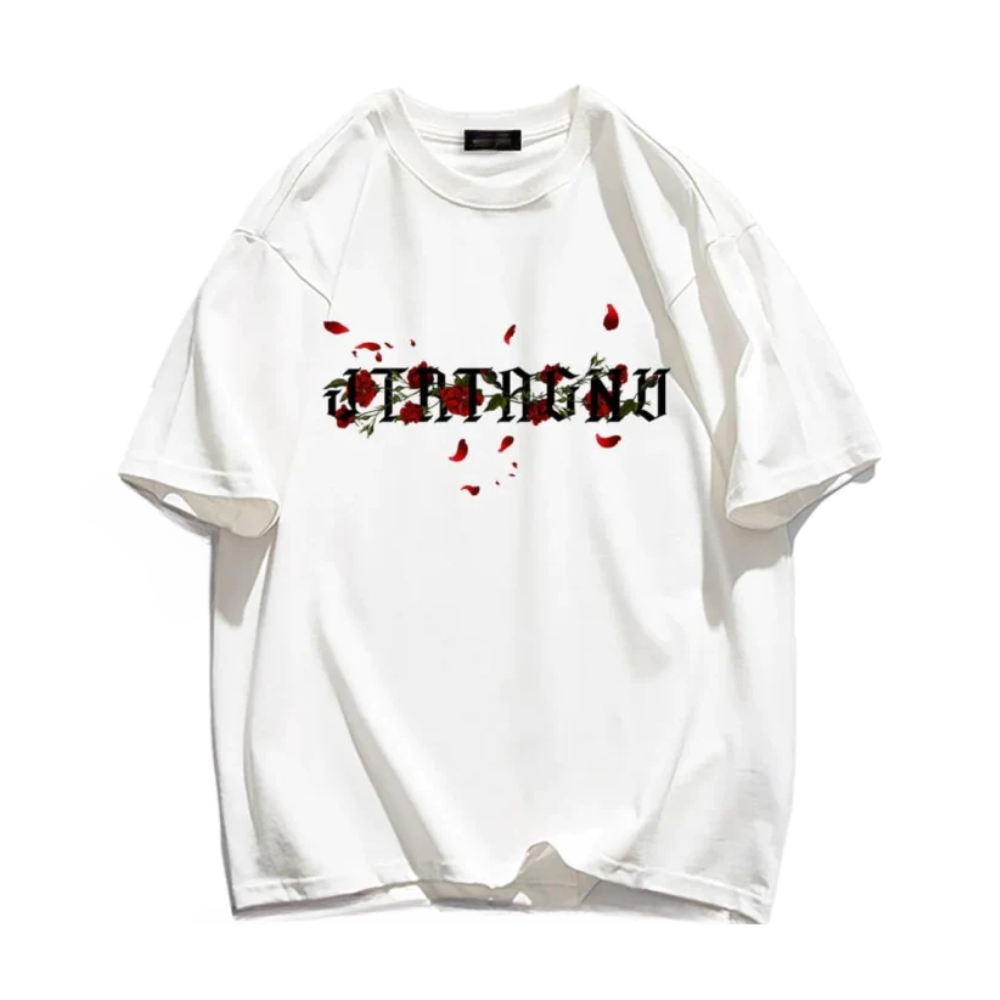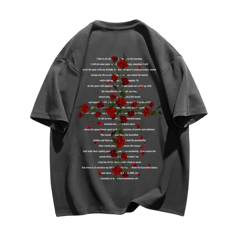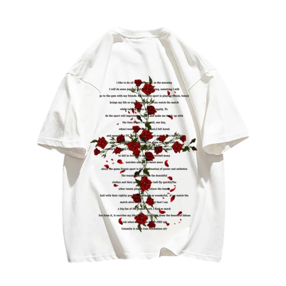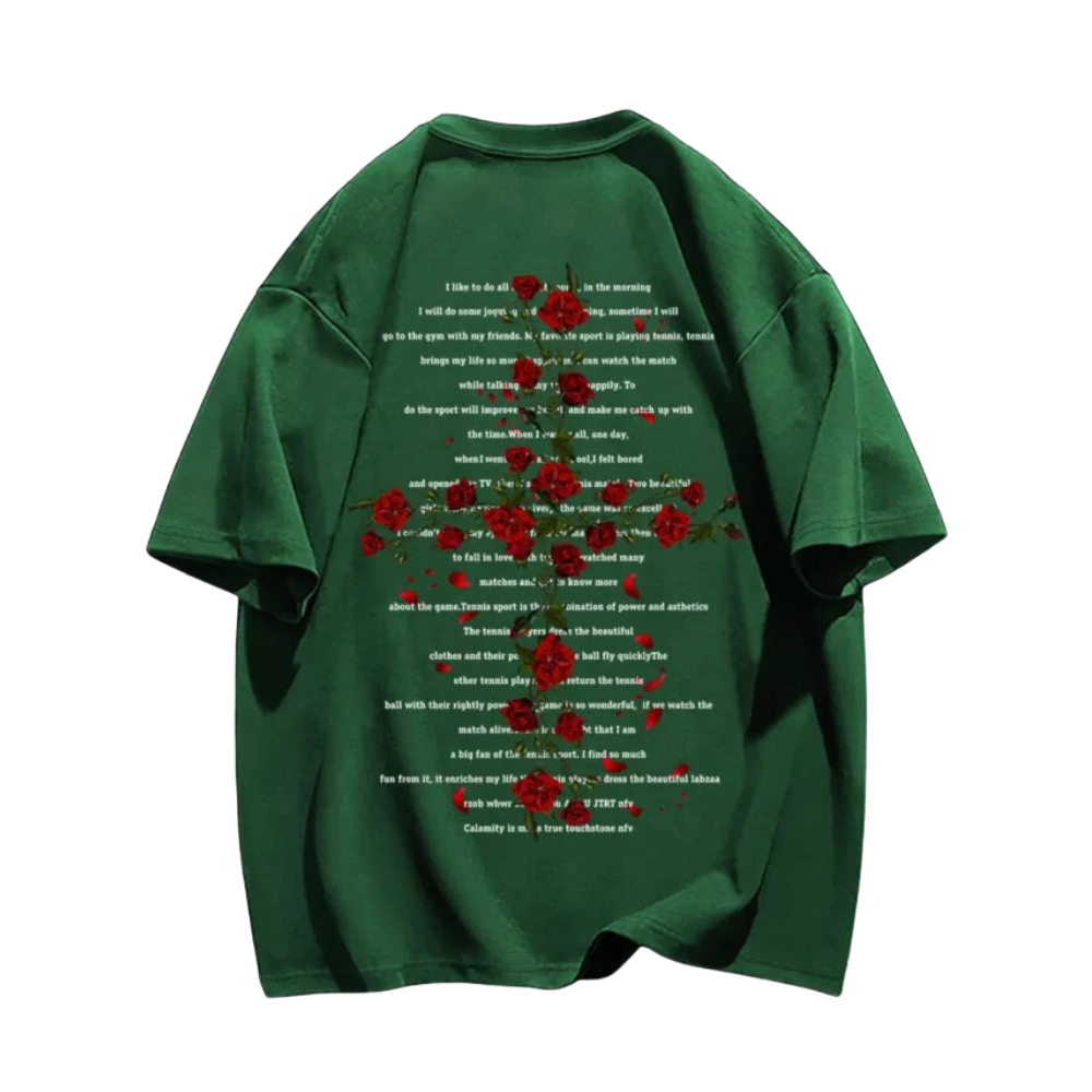 The rose symbolizes love and beauty, while the cross represents faith and spirituality, making this t-shirt a meaningful and fashionable choice. The print is carefully crafted to ensure vibrant colors and crisp details, making it a standout piece in any outfit. Available in a range of sizes, this t-shirt is suitable for both men and women.