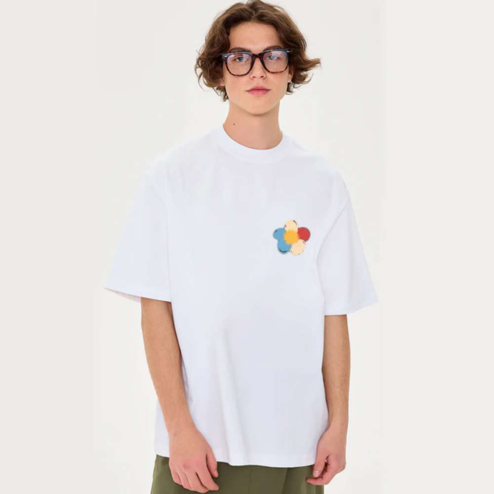 But what sets our t-shirt apart is its innovative design. The flowers are strategically placed to create a unique and eye-catching look. This makes it a perfect choice for any casual occasion, whether you're running errands or meeting friends for a coffee.