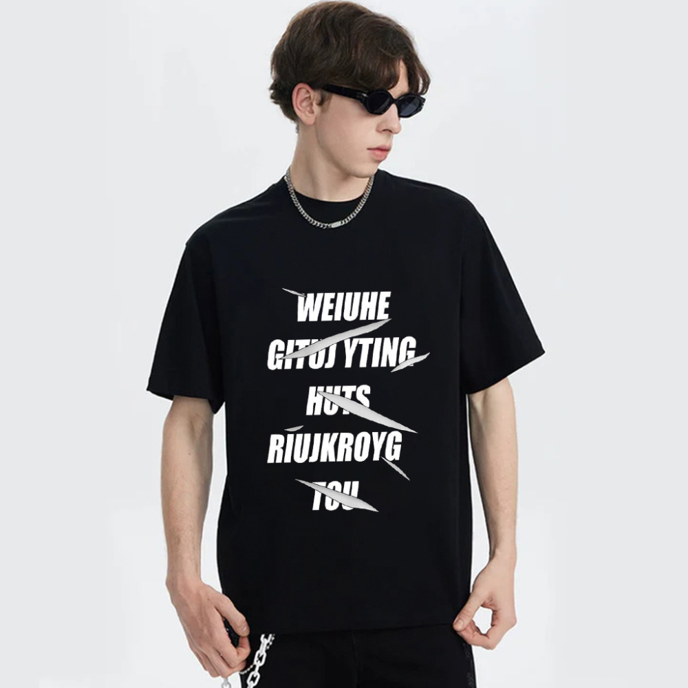 The design features a bold and eye-catching print of simplified letters, adding a unique and modern touch to the classic t-shirt. The letters are strategically placed to create a visually appealing pattern, making this t-shirt a true standout piece.