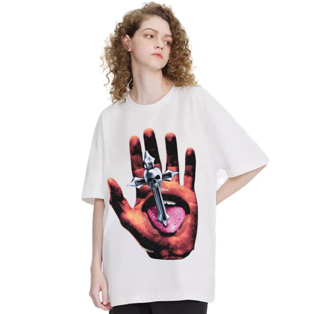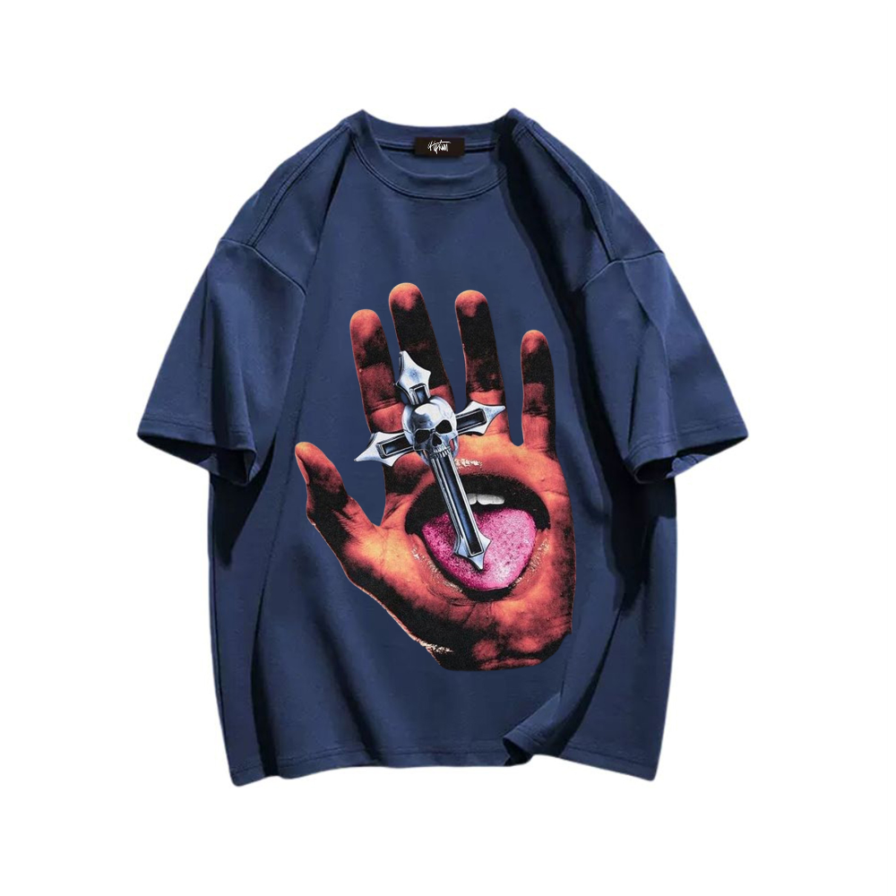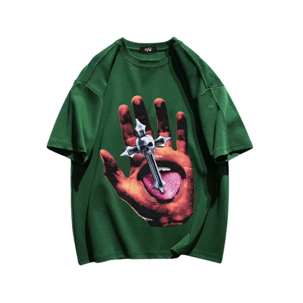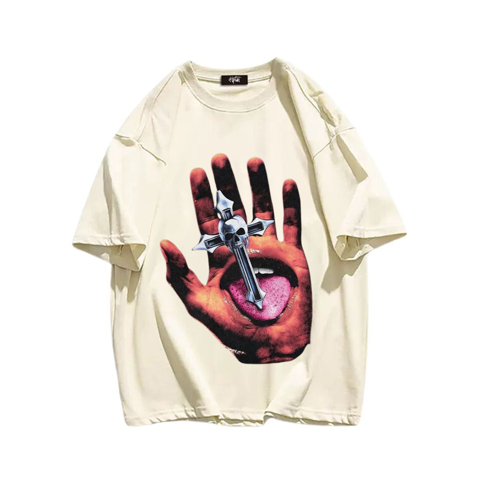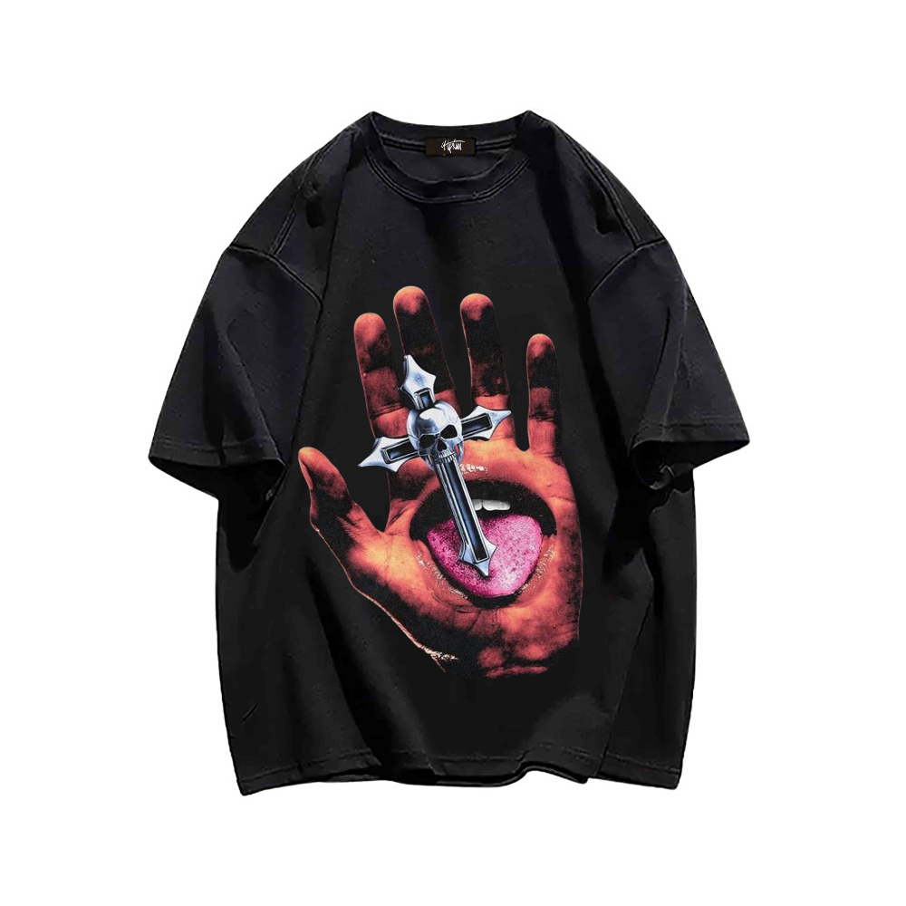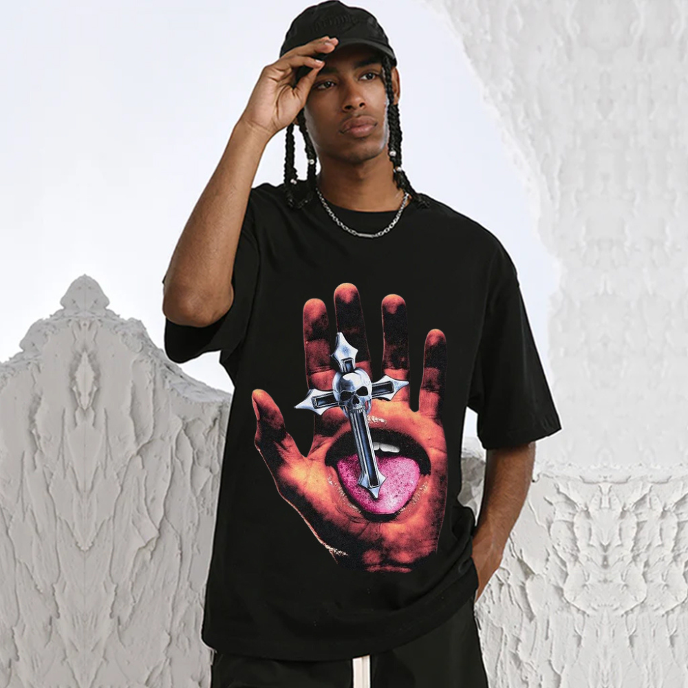 Introducing our edgy and versatile "Skull Cross On Palm" t-shirt, perfect for adding a touch of rebellion to your wardrobe. Made from high-quality cotton, this t-shirt features a bold graphic of a skull with a cross on its palm, giving it a unique and eye-catching look.
