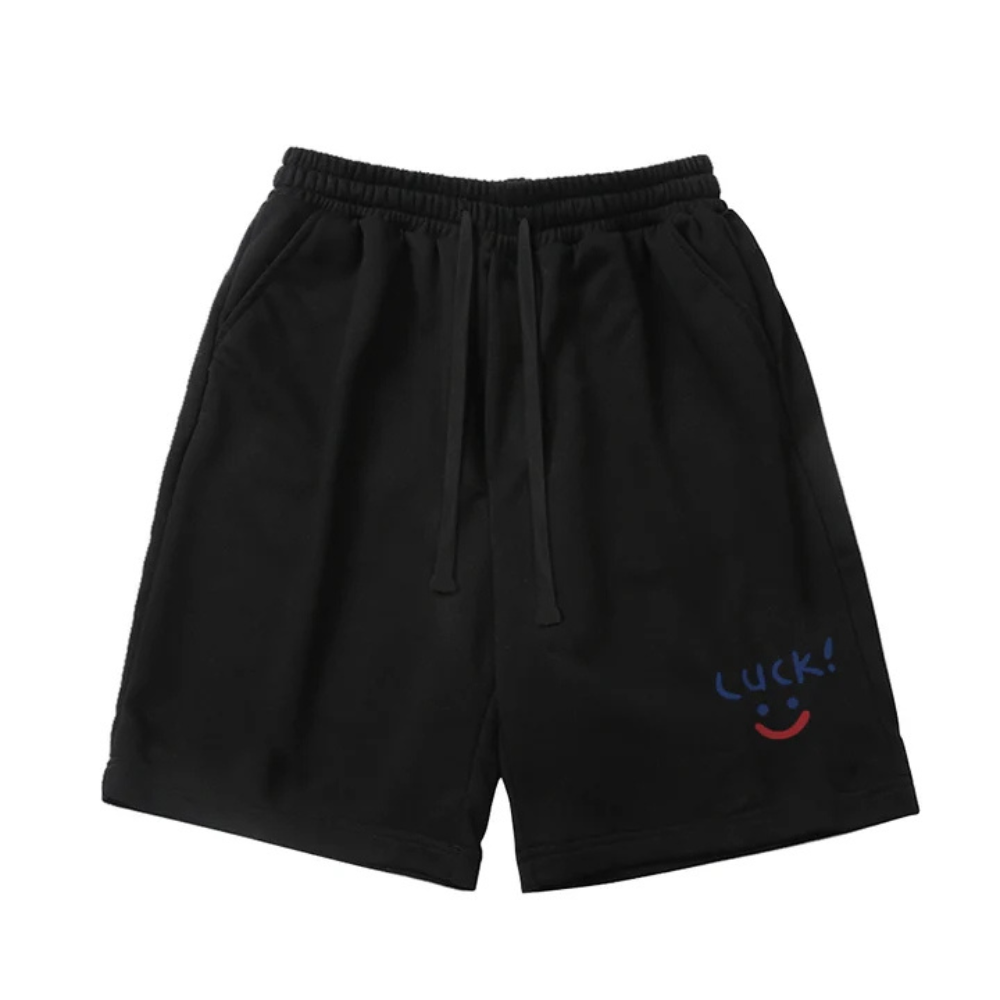 The "Smiley Luck" Shorts are available in a range of sizes to ensure a perfect fit for everyone. The elastic waistband and drawstring closure provide an adjustable and secure fit. The shorts also feature two side pockets, making them practical for carrying small essentials. The lightweight fabric makes them ideal for warmer weather, while the relaxed fit allows for ease of movement.