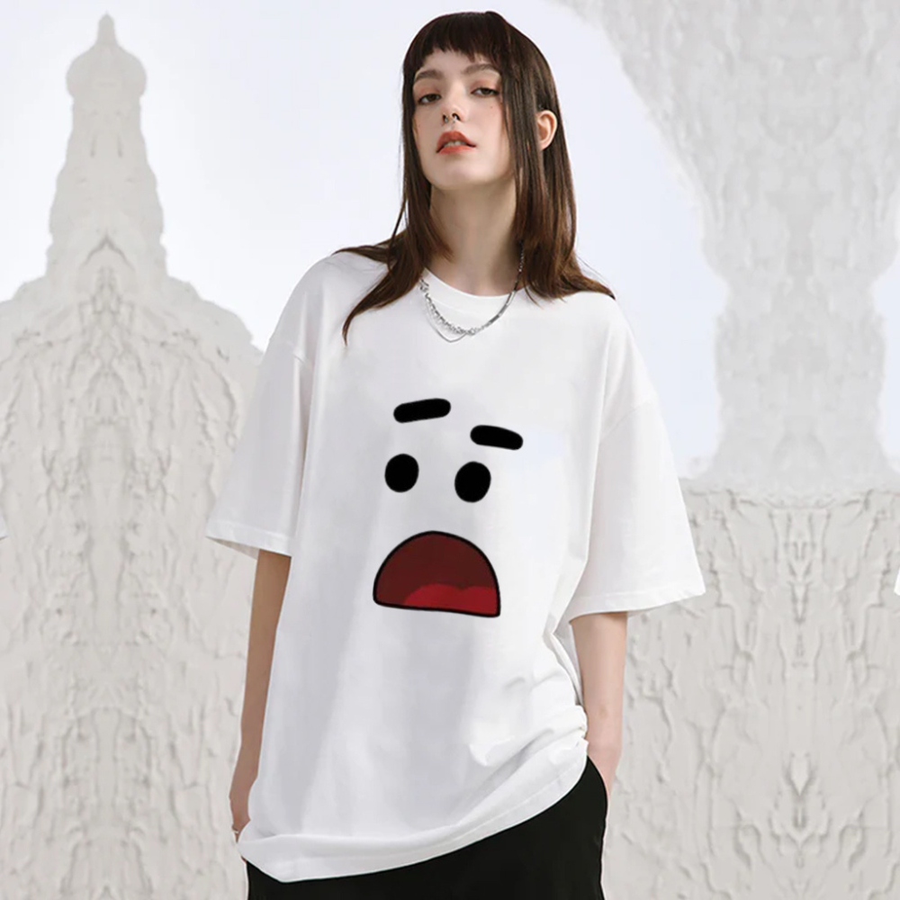 The design features a bold and eye-catching surprised expression, perfect for those who love to stand out and make a statement. The vibrant colors and detailed graphics make this shirt a must-have for any fashion-forward individual.