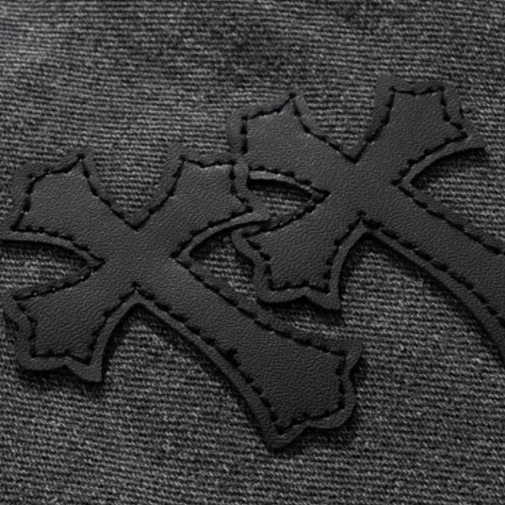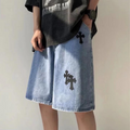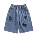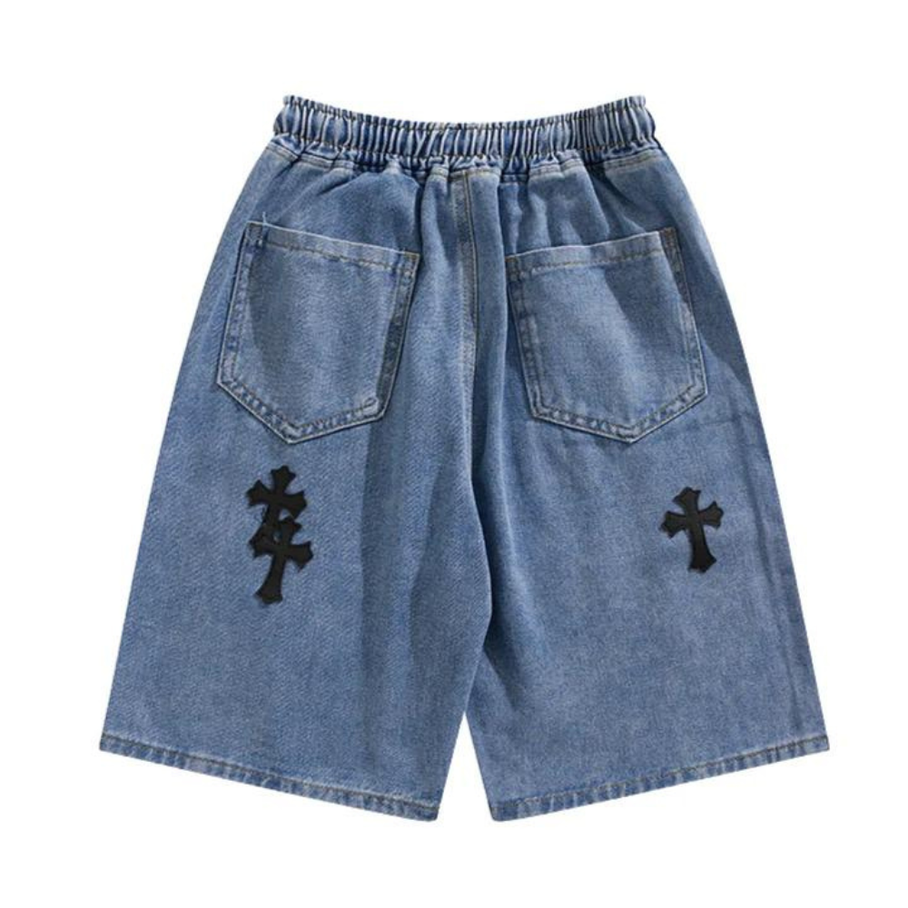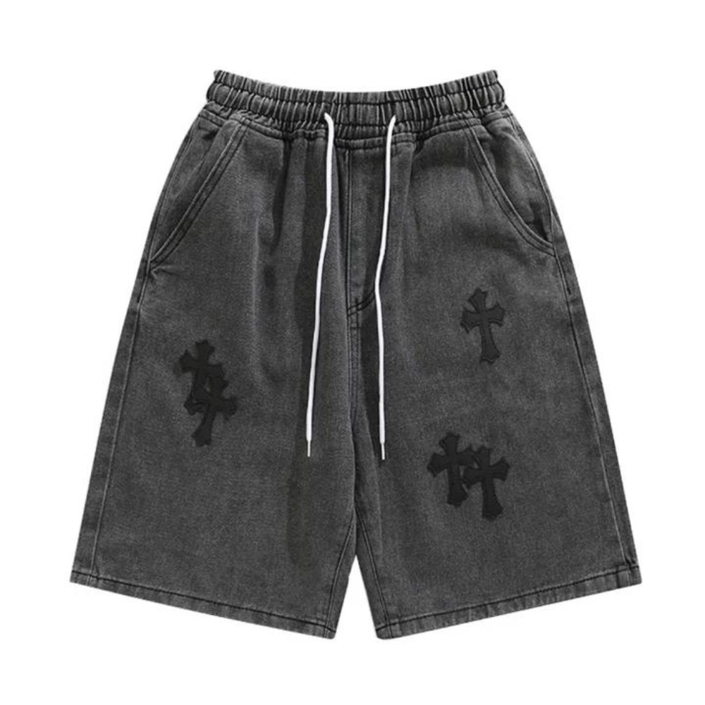 Crafted from high-quality denim, these shorts feature intricate cross embroidery on the front, adding a unique and edgy touch to your look. The denim material is soft and breathable, ensuring maximum comfort even on the hottest days.