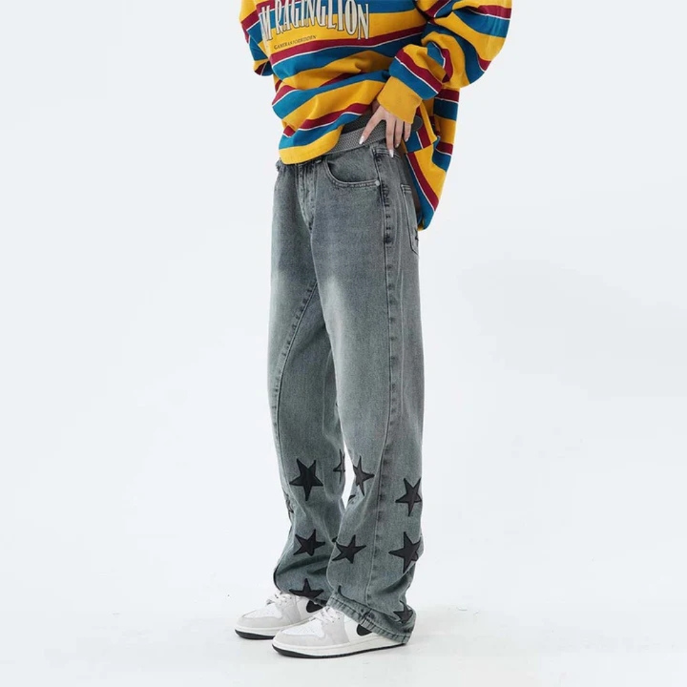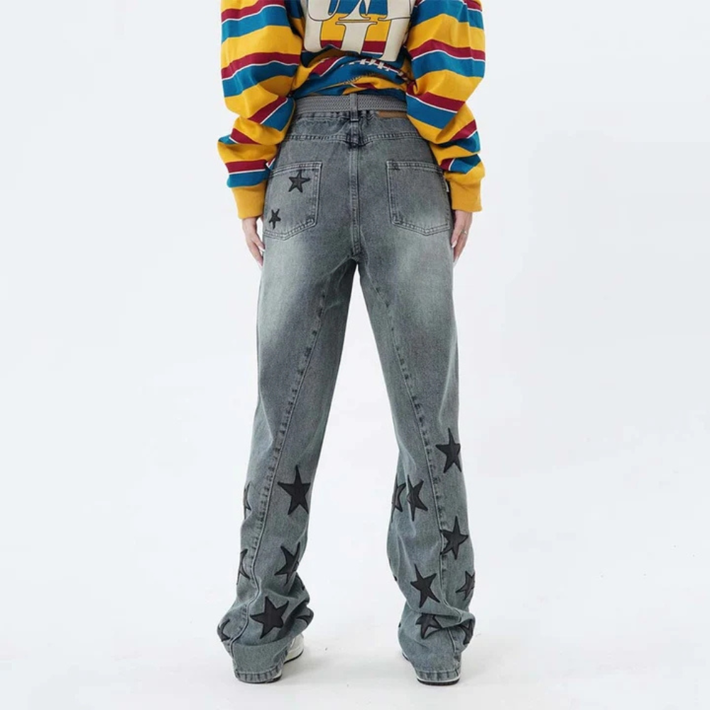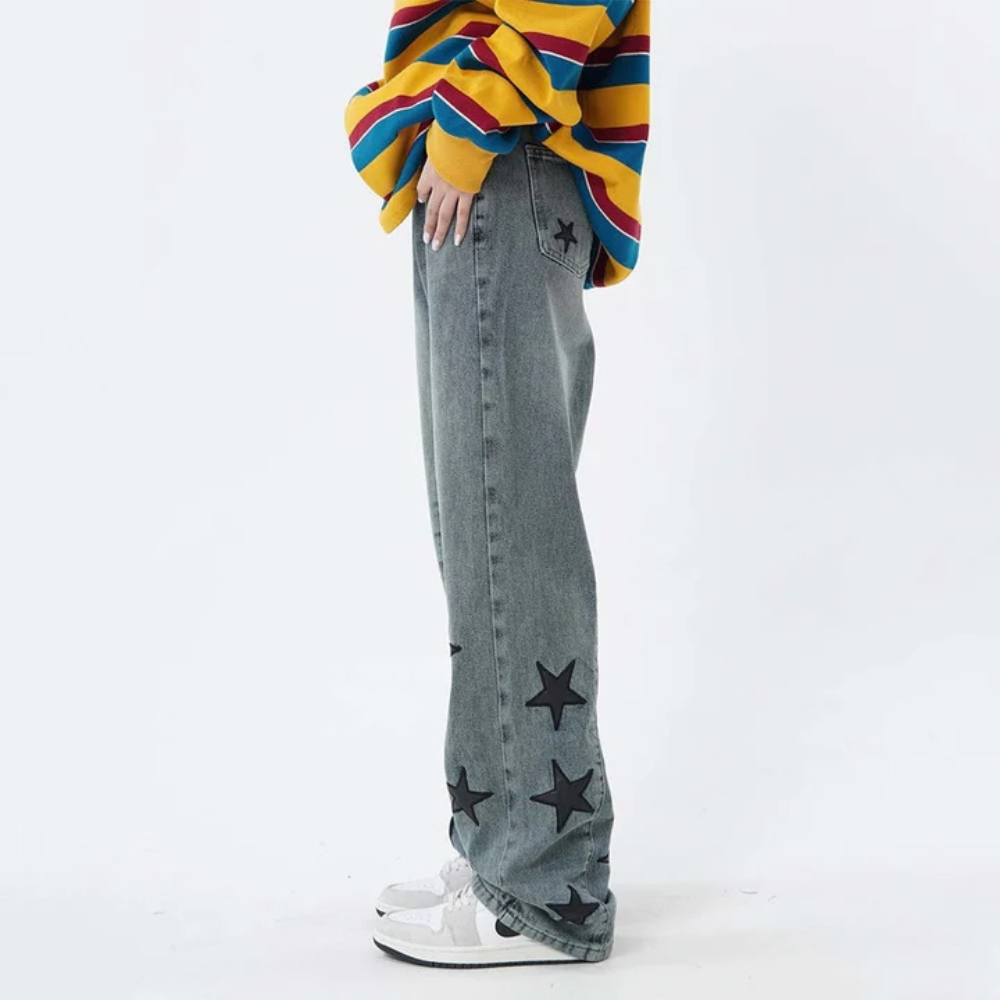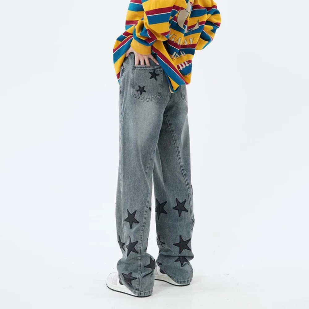 Upgrade your denim game with these Vintage Loose Star Graphic Jeans. Made from high-quality denim, these jeans feature a loose fit for ultimate comfort and a vintage-inspired star graphic design for a unique touch. The distressed detailing adds a touch of edginess to the overall look. These jeans are perfect for any casual occasion and can be dressed up or down depending on your style. The high waist design and button fly closure provide a flattering fit for all body types. Available in a range of sizes, these jeans are a must-have for any fashion-forward individual.